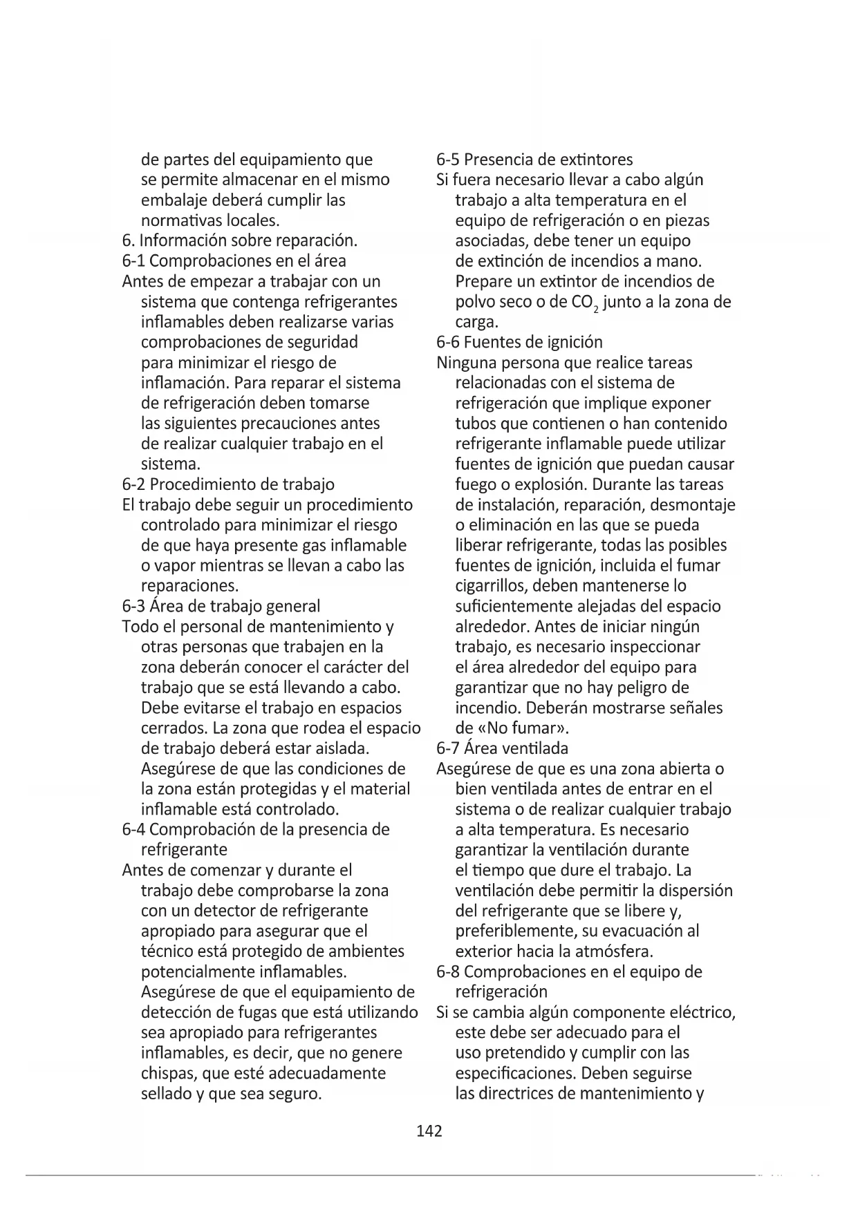6-1 Comprobaciones en el área Antes de empezar a trabajar con un sistema que contenga refrigerantes inamables deben realizarse varias comprobaciones de seguridad para minimizar el riesgo de inamación. Para reparar el sistema de refrigeración deben tomarse las siguientes precauciones antes de realizar cualquier trabajo en el sistema. 6-2 Procedimiento de trabajo El trabajo debe seguir un procedimiento controlado para minimizar el riesgo de que haya presente gas inamable o vapor mientras se llevan a cabo las reparaciones. 6-3 Área de trabajo general Todo el personal de mantenimiento y otras personas que trabajen en la zona deberán conocer el carácter del trabajo que se está llevando a cabo. Debe evitarse el trabajo en espacios cerrados. La zona que rodea el espacio de trabajo deberá estar aislada. Asegúrese de que las condiciones de la zona están protegidas y el material inamable está controlado. 6-4 Comprobación de la presencia de refrigerante Antes de comenzar y durante el trabajo debe comprobarse la zona con un detector de refrigerante apropiado para asegurar que el técnico está protegido de ambientes potencialmente inamables. Asegúrese de que el equipamiento de detección de fugas que está ulizando sea apropiado para refrigerantes inamables, es decir, que no genere chispas, que esté adecuadamente sellado y que sea seguro. 6-5 Presencia de exntores Si fuera necesario llevar a cabo algún trabajo a alta temperatura en el equipo de refrigeración o en piezas asociadas, debe tener un equipo de exnción de incendios a mano. Prepare un exntor de incendios de polvo seco o de CO