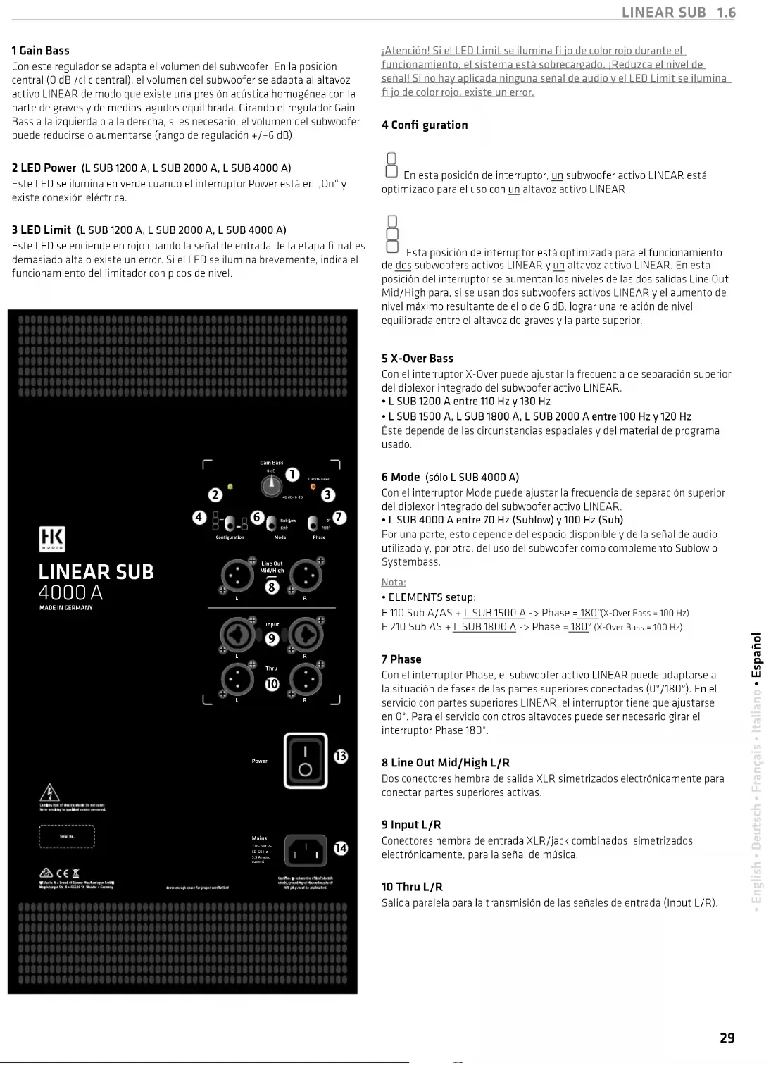 1 Gain Bass Con este regulador se adapta el volumen del subwoofer. En la posición central (0 dB /clic central), el volumen del subwoofer se adapta al altavoz activo LINEAR de modo que existe una presión acústica homogénea con la parte de graves y de medios-agudos equilibrada. Girando el regulador Gain Bass a la izquierda o a la derecha, si es necesario, el volumen del subwoofer puede reducirse o aumentarse (rango de regulación+/–6dB). 2 LED Power (L SUB 1200 A, L SUB 2000 A, L SUB 4000 A) Este LED se ilumina en verde cuando el interruptor Power está en „On“ y existe conexión eléctrica. 3 LED Limit (L SUB 1200 A, L SUB 2000 A, L SUB 4000 A) Este LED se enciende en rojo cuando la señal de entrada de la etapa fi nal es demasiado alta o existe un error. Si el LED se ilumina brevemente, indica el funcionamiento del limitador con picos de nivel. ¡Atención! Si el LED Limit se ilumina fi jo de color rojo durante el funcionamiento, el sistema está sobrecargado. ¡Reduzca el nivel de señal! Si no hay aplicada ninguna señal de audio y el LED Limit se ilumina fi jo de color rojo, existe un error. 4 Confi guration En esta posición de interruptor, un subwoofer activo LINEAR está optimizado para el uso con un altavoz activo LINEAR . Esta posición de interruptor está optimizada para el funcionamiento de dos subwoofers activos LINEAR y un altavoz activo LINEAR. En esta posición del interruptor se aumentan los niveles de las dos salidas Line Out Mid/High para, si se usan dos subwoofers activos LINEAR y el aumento de nivel máximo resultante de ello de 6 dB, lograr una relación de nivel equilibrada entre el altavoz de graves y la parte superior. 5 X-Over Bass Con el interruptor X-Over puede ajustar la frecuencia de separación superior del diplexor integrado del subwoofer activo LINEAR.