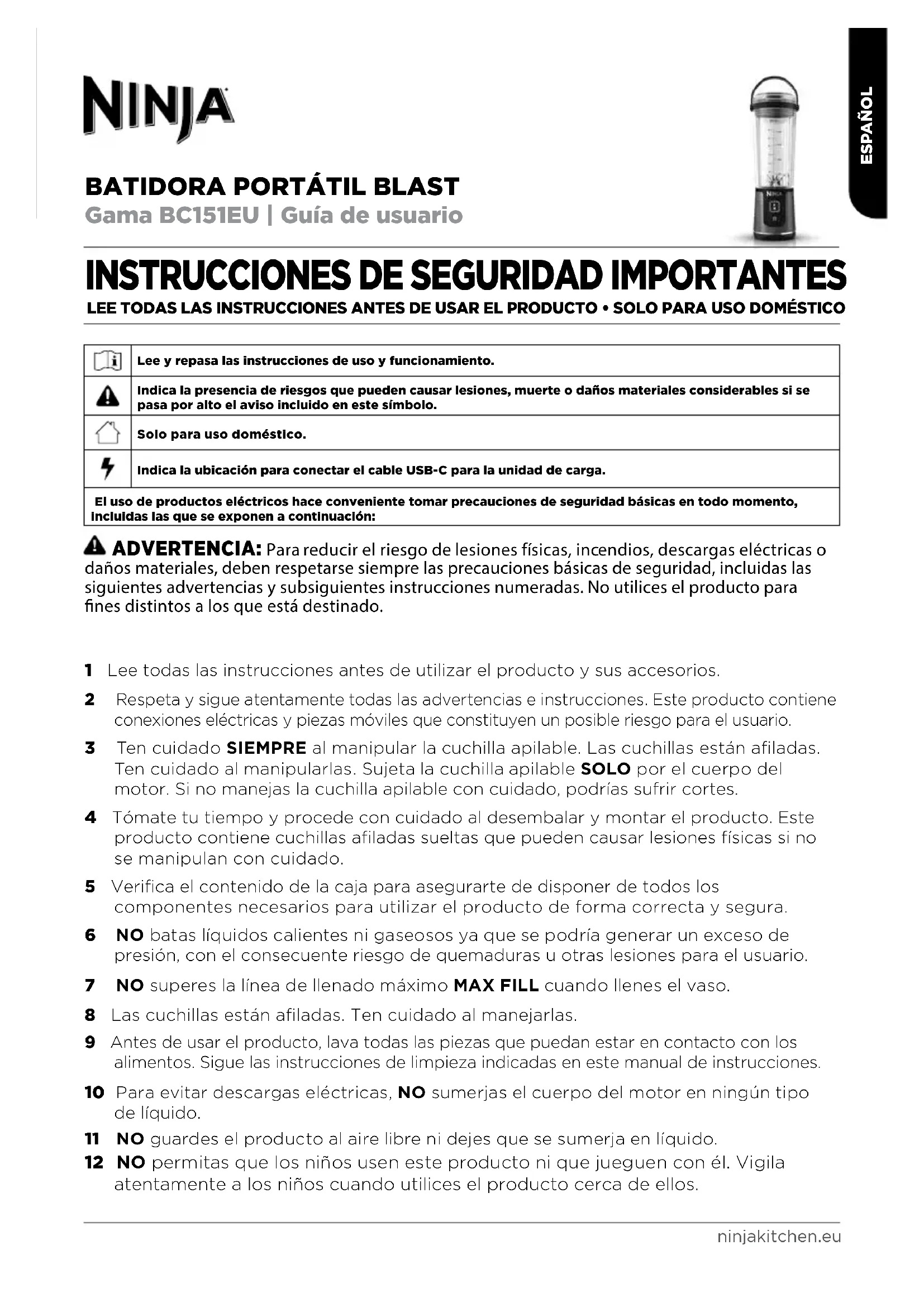 LEE TODAS LAS INSTRUCCIONES ANTES DE USAR EL PRODUCTO • SOLO PARA USO DOMÉSTICOLee y repasa las instrucciones de uso y funcionamiento.Indica la presencia de riesgos que pueden causar lesiones, muerte o daños materiales considerables si se pasa por alto el aviso incluido en este símbolo.Solo para uso doméstico.Indica la ubicación para conectar el cable USB-C para la unidad de carga. El uso de productos eléctricos hace conveniente tomar precauciones de seguridad básicas en todo momento, incluidas las que se exponen a continuación: ESPAÑOLninjakitchen.eu 13 Este producto NO deben utilizarlo personas con facultades físicas, sensoriales o intelectuales disminuidas, o que carezcan de la experiencia y los conocimientos debidos, salvo que las supervise e instruya específicamente otra persona responsable de su seguridad. 14 Antes de cada uso, comprueba que la cuchilla apilable no tenga daños. Si alguna cuchilla está deformada o sospechas que está dañada, ponte en contacto con SharkNinja para solicitar una de recambio. 15 NO intentes afilar las cuchillas. 16 NO permitas que ninguna pieza del producto entre en contacto con superficies calientes, incluyendo placas de cocina y otros productos que emitan calor. 17 Utiliza SIEMPRE el producto sobre una superficie seca y llana. 18 Mantén las manos, el cabello y la ropa fuera del vaso cuando lo estés llenando yutilizando. 19 Usa SOLO accesorios y complementos suministrados con el producto o recomendados por SharkNinja. El uso de accesorios no recomendados o no vendidos por SharkNinja podría provocar incendios, descargas eléctricas o lesiones. 20 Durante el funcionamiento y el manejo del producto, evita el contacto con las piezas que se mueven. 21 NO utilices el producto con el recipiente vacío. 22 NO introduzcas en el microondas ningún recipiente ni accesorio suministrado con el producto. 23 NO uses el producto para moler. 24 Antes de usar el producto, asegúrate de retirar todos los utensilios de los recipientes. Si dejas algún utensilio sin retirar, el vaso puede romperse, pudiendo provocar daños personales y materiales. 25 NO intentes desactivar el mecanismo de bloqueo. Asegúrate de que el vaso y la tapa SIP están correctamente colocados antes de poner en funcionamiento la unidad. 26 NO sometas los recipientes ni los accesorios a cambios bruscos de temperatura. Podrían sufrir daños. 27 NUNCA dejes el producto desatendido mientras se esté usando. 28 Si encuentras ingredientes sin batir pegados a los laterales del vaso, apaga el producto usando botón de encendido/apagado y usa una espátula para despegar los ingredientes. 29 NO intentes retirar el vaso y la tapa del cuerpo del motor si la cuchilla apilable sigue en funcionamiento. Espera hasta que el producto se detenga por completo antes de retirar la tapa o el vaso. 30 NO dejes guardados los ingredientes en el vaso durante mucho tiempo antes o después de batirlos. Algunos alimentos pueden contener ingredientes activos o liberar gases que se expandirán si los dejas dentro de un recipiente cerrado, lo que hará que se acumule presión, con el consiguiente riesgo de lesiones. 31 Si la batidora se sobrecalienta, un conmutador térmico se activará y bloqueará temporalmente el motor. Para reiniciarla, APAGA la batidora portátil Ninja Blast™ usando el botón de encendido/apagado y déjala enfriar durante 15 minutos antes de volver a usarla. 32 NO proceses ingredientes secos sin añadir líquido al vaso mezclador. El producto no está diseñado para batir en seco.