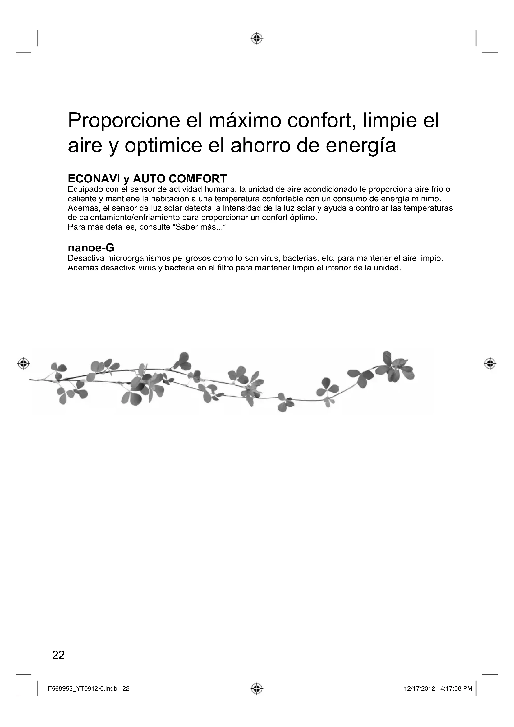 - .ﺔﻴﻠﺧﺍﺪﻟﺍ ﺓﺪﺣﻮﻟﺍ ﻦﻣ ﺀﺎﻣ ﺏﺮﺴﺗ ﺡﻼﺻﻻﺍﻭ ﻝﺎﻄﻋﻻﺍ ﻦﻋ ﺚﺤﺒﻟﺍ ﺡﻼﺻﻻﺍﻭ ﻝﺎﻄﻋﻻﺍ ﻦﻋ ﺚﺤﺒﻟﺍ / ﻒﻴﻈﻨﺘﻟﺍ ﺕﺎﻤﻴﻠﻌﺗ 02_F568955_YT0912-0_AR.indd 2102_F568955_YT0912-0_AR.indd 21 12/17/2012 3:39:43 PM12/17/2012 3:39:43 PM22 Proporcione el máximo confort, limpie el aire y optimice el ahorro de energía ECONAVI y AUTO COMFORT Equipado con el sensor de actividad humana, la unidad de aire acondicionado le proporciona aire frío o caliente y mantiene la habitación a una temperatura confortable con un consumo de energía mínimo. Además, el sensor de luz solar detecta la intensidad de la luz solar y ayuda a controlar las temperaturas de calentamiento/enfriamiento para proporcionar un confort óptimo. Para más detalles, consulte “Saber más...”. nanoe-G Desactiva microorganismos peligrosos como lo son virus, bacterias, etc. para mantener el aire limpio. Además desactiva virus y bacteria en el fi ltro para mantener limpio el interior de la unidad. F568955_YT0912-0.indb 22F568955_YT0912-0.indb 22 12/17/2012 4:17:08 PM12/17/2012 4:17:08 PM23 Español (LE) Guía rápida
