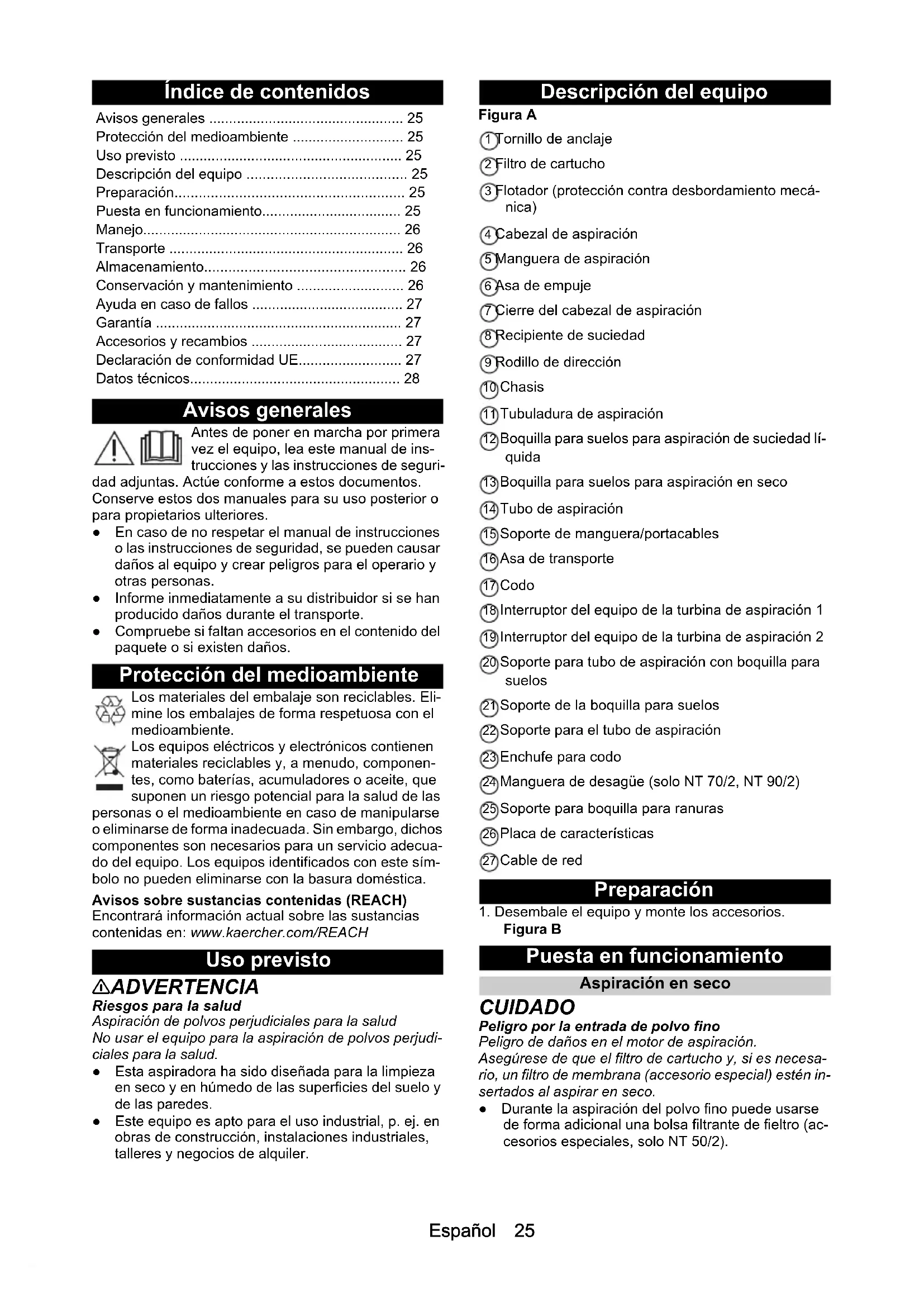 H05VV-F 2x1,0 H05VV-F 2x1,0 H05VV-F 2x1,0 Onderdeelnummer (EU) 9.770-933.0 9.770-933.0 9.770-933.0 Kabellengte m 7,5 7,5 7,5Español 25 Índice de contenidos Avisos generales Antes de poner en marcha por primera vez el equipo, lea este manual de ins- trucciones y las instrucciones de seguri- dad adjuntas. Actúe conforme a estos documentos. Conserve estos dos manuales para su uso posterior o para propietarios ulteriores. ● En caso de no respetar el manual de instrucciones o las instrucciones de seguridad, se pueden causar daños al equipo y crear peligros para el operario y otras personas. ● Informe inmediatamente a su distribuidor si se han producido daños durante el transporte. ● Compruebe si faltan accesorios en el contenido del paquete o si existen daños. Protección del medioambiente Los materiales del embalaje son reciclables. Eli- mine los embalajes de forma respetuosa con el medioambiente. Los equipos eléctricos y electrónicos contienen materiales reciclables y, a menudo, componen- tes, como baterías, acumuladores o aceite, que suponen un riesgo potencial para la salud de las personas o el medioambiente en caso de manipularse o eliminarse de forma inadecuada. Sin embargo, dichos componentes son necesarios para un servicio adecua- do del equipo. Los equipos identificados con este sím- bolo no pueden eliminarse con la basura doméstica. Avisos sobre sustancias contenidas (REACH) Encontrará información actual sobre las sustancias contenidas en: www.kaercher.com/REACH Uso previsto 몇 ADVERTENCIA Riesgos para la salud Aspiración de polvos perjudiciales para la salud No usar el equipo para la aspiración de polvos perjudi- ciales para la salud. ● Esta aspiradora ha sido diseñada para la limpieza en seco y en húmedo de las superficies del suelo y de las paredes. ● Este equipo es apto para el uso industrial, p. ej. en obras de construcción, instalaciones industriales, talleres y negocios de alquiler. Descripción del equipo Figura A 1 Tornillo de anclaje 2 Filtro de cartucho 3 Flotador (protección contra desbordamiento mecá- nica) 4 Cabezal de aspiración 5 Manguera de aspiración 6 Asa de empuje 7 Cierre del cabezal de aspiración 8 Recipiente de suciedad 9 Rodillo de dirección 10 Chasis 11 Tubuladura de aspiración 12 Boquilla para suelos para aspiración de suciedad lí- quida 13 Boquilla para suelos para aspiración en seco 14 Tubo de aspiración 15 Soporte de manguera/portacables 16 Asa de transporte 17 Codo 18 Interruptor del equipo de la turbina de aspiración 1 19 Interruptor del equipo de la turbina de aspiración 2 20 Soporte para tubo de aspiración con boquilla para suelos 21 Soporte de la boquilla para suelos 22 Soporte para el tubo de aspiración 23 Enchufe para codo 24 Manguera de desagüe (solo NT 70/2, NT 90/2) 25 Soporte para boquilla para ranuras 26 Placa de características 27 Cable de red Preparación