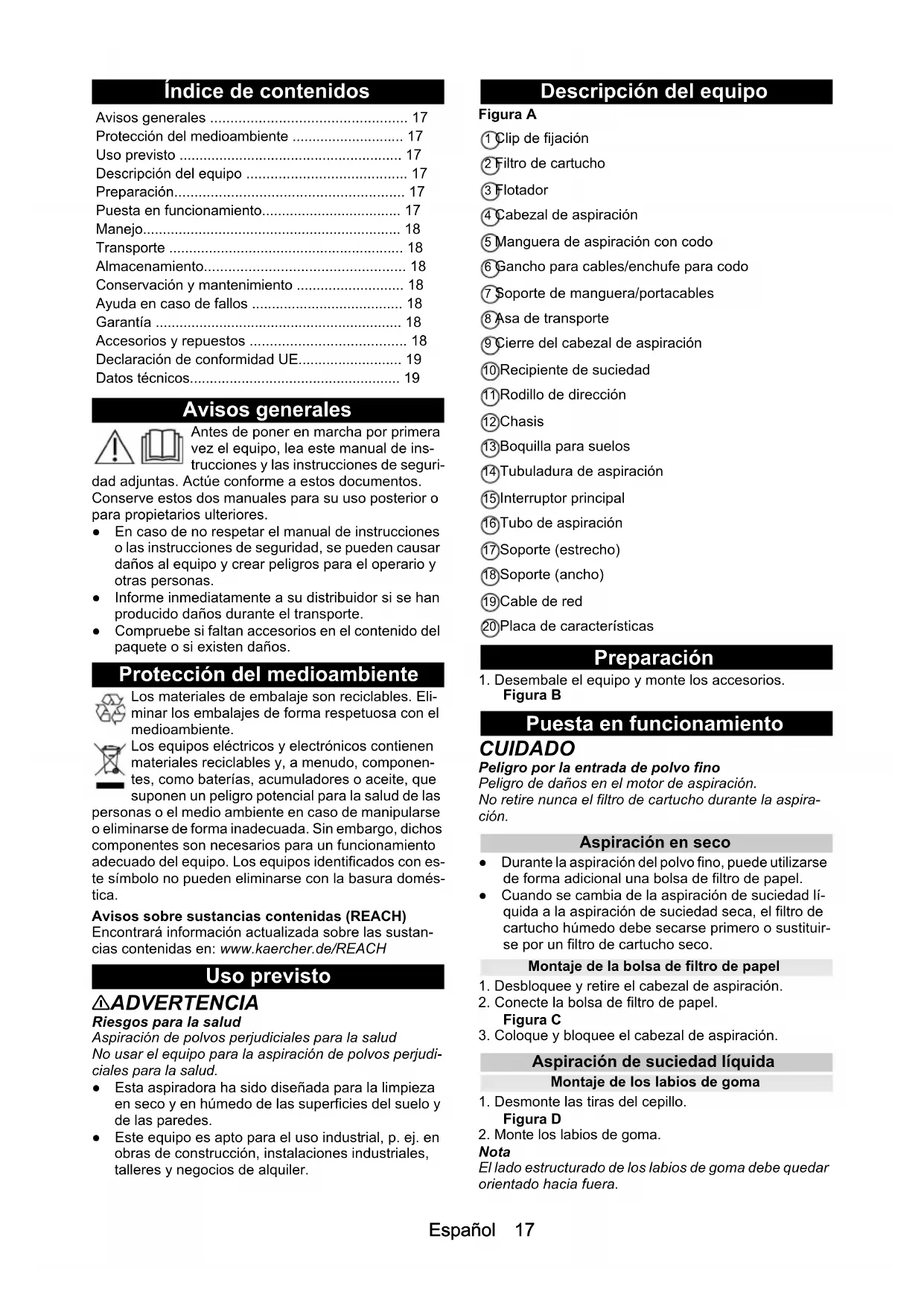 H05VV-F 2x1,0 H05VV-F 2x1,0 H05VV-F 2x1,0 Numero componenti (EU) 9.770-820.0 9.770-820.0 9.770-820.0 Lunghezza cavo m 6,5 6,5 6,5Español 17 Índice de contenidos Avisos generales Antes de poner en marcha por primera vez el equipo, lea este manual de ins- trucciones y las instrucciones de seguri- dad adjuntas. Actúe conforme a estos documentos. Conserve estos dos manuales para su uso posterior o para propietarios ulteriores. ● En caso de no respetar el manual de instrucciones o las instrucciones de seguridad, se pueden causar daños al equipo y crear peligros para el operario y otras personas. ● Informe inmediatamente a su distribuidor si se han producido daños durante el transporte. ● Compruebe si faltan accesorios en el contenido del paquete o si existen daños. Protección del medioambiente Los materiales de embalaje son reciclables. Eli- minar los embalajes de forma respetuosa con el medioambiente. Los equipos eléctricos y electrónicos contienen materiales reciclables y, a menudo, componen- tes, como baterías, acumuladores o aceite, que suponen un peligro potencial para la salud de las personas o el medio ambiente en caso de manipularse o eliminarse de forma inadecuada. Sin embargo, dichos componentes son necesarios para un funcionamiento adecuado del equipo. Los equipos identificados con es- te símbolo no pueden eliminarse con la basura domés- tica. Avisos sobre sustancias contenidas (REACH) Encontrará información actualizada sobre las sustan- cias contenidas en: www.kaercher.de/REACH Uso previsto 몇 ADVERTENCIA Riesgos para la salud Aspiración de polvos perjudiciales para la salud No usar el equipo para la aspiración de polvos perjudi- ciales para la salud. ● Esta aspiradora ha sido diseñada para la limpieza en seco y en húmedo de las superficies del suelo y de las paredes. ● Este equipo es apto para el uso industrial, p. ej. en obras de construcción, instalaciones industriales, talleres y negocios de alquiler. Descripción del equipo Figura A 1 Clip de fijación 2 Filtro de cartucho 3 Flotador 4 Cabezal de aspiración 5 Manguera de aspiración con codo 6 Gancho para cables/enchufe para codo 7 Soporte de manguera/portacables 8 Asa de transporte 9 Cierre del cabezal de aspiración 10 Recipiente de suciedad 11 Rodillo de dirección 12 Chasis 13 Boquilla para suelos 14 Tubuladura de aspiración 15 Interruptor principal 16 Tubo de aspiración 17 Soporte (estrecho) 18 Soporte (ancho) 19 Cable de red 20 Placa de características Preparación
