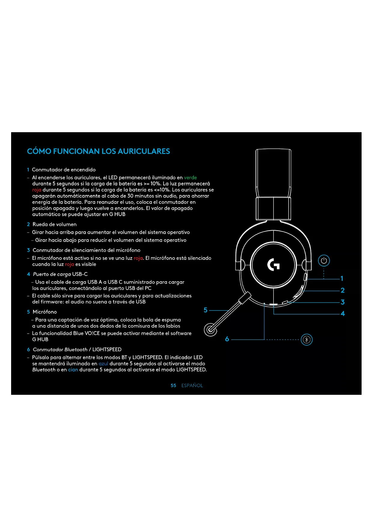 1 Conmutador de encendido – Al encenderse los auriculares, el LED permanecerá iluminado en verde durante 5 segundos si la carga de la batería es >= 10%. La luz permanecerá roja durante 5 segundos si la carga de la batería es <=10%. Los auriculares se apagarán automáticamente al cabo de 30 minutos sin audio, paraahorrar energía de la batería. Para reanudar el uso, coloca el conmutador en posición apagada y luego vuelve a encenderlos. El valor de apagado automático se puede ajustar en G HUB 2 Rueda de volumen – Girar hacia arriba para aumentar el volumen del sistema operativo – Girar hacia abajo para reducir el volumen del sistema operativo 3 Conmutador de silenciamiento del micrófono – El micrófono está activo si no se ve una luz roja. El micrófono está silenciado cuando la luz roja es visible 4 Puerto de carga USB-C – Usa el cable de carga USB A a USB C suministrado para cargar losauriculares, conectándolo al puerto USB del PC – El cable sólo sirve para cargar los auriculares y para actualizaciones delrmware: el audio no suena a través de USB 5 Micrófono – Para una captación de voz óptima, coloca la bola de espuma aunadistancia de unos dos dedos de la comisura de los labios – La funcionalidad Blue VO!CE se puede activar mediante el soware G HUB 6 Conmutador Bluetooth / LIGHTSPEED – Púlsalo para alternar entre los modos BT y LIGHTSPEED. El indicador LED se mantendrá iluminado en azul durante 5 segundos al activarse el modo Bluetooth o en cian durante 5 segundos al activarse el modo LIGHTSPEED.