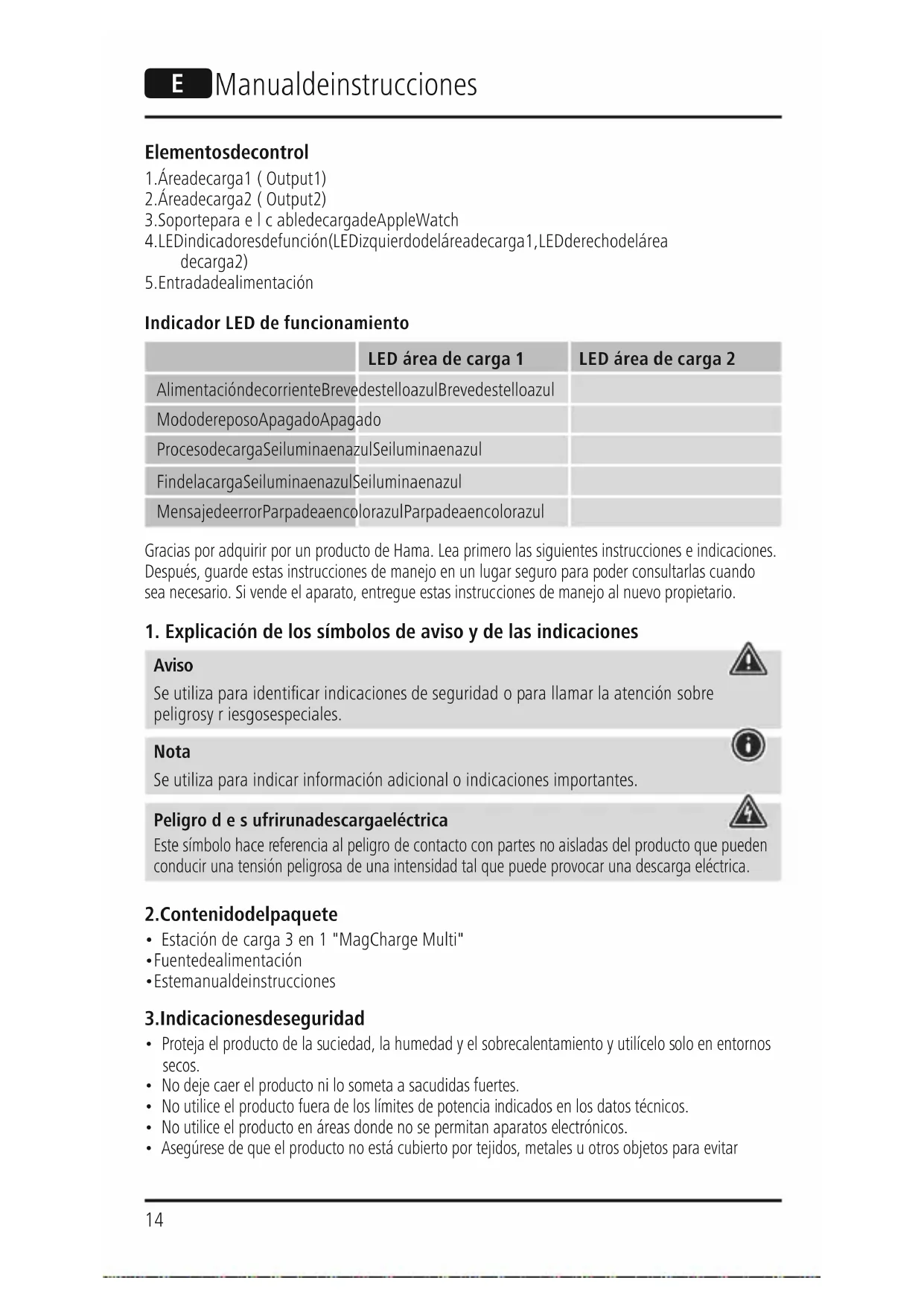 IndicadorLED de funcionamiento LED áreadecarga 1LED áreadecarga 2 Alimentación de corriente Breve destello azul Breve destello azul Modo de reposo Apagado Apagado Proceso de carga Se ilumina en azul Se ilumina en azul Fin de la carga Se ilumina en azul Se ilumina en azul Mensaje de error Parpadea en color azul Parpadea en color azul Gracias por adquirir porunproducto de Hama. Lea primerolas siguientes instruccioneseindicaciones. Después, guarde estas instrucciones de manejoenunlugar seguropar apoderconsultarlas cuando sea necesario.Sivende el aparato,entregue estas instrucciones de manejoalnuevo propietario.