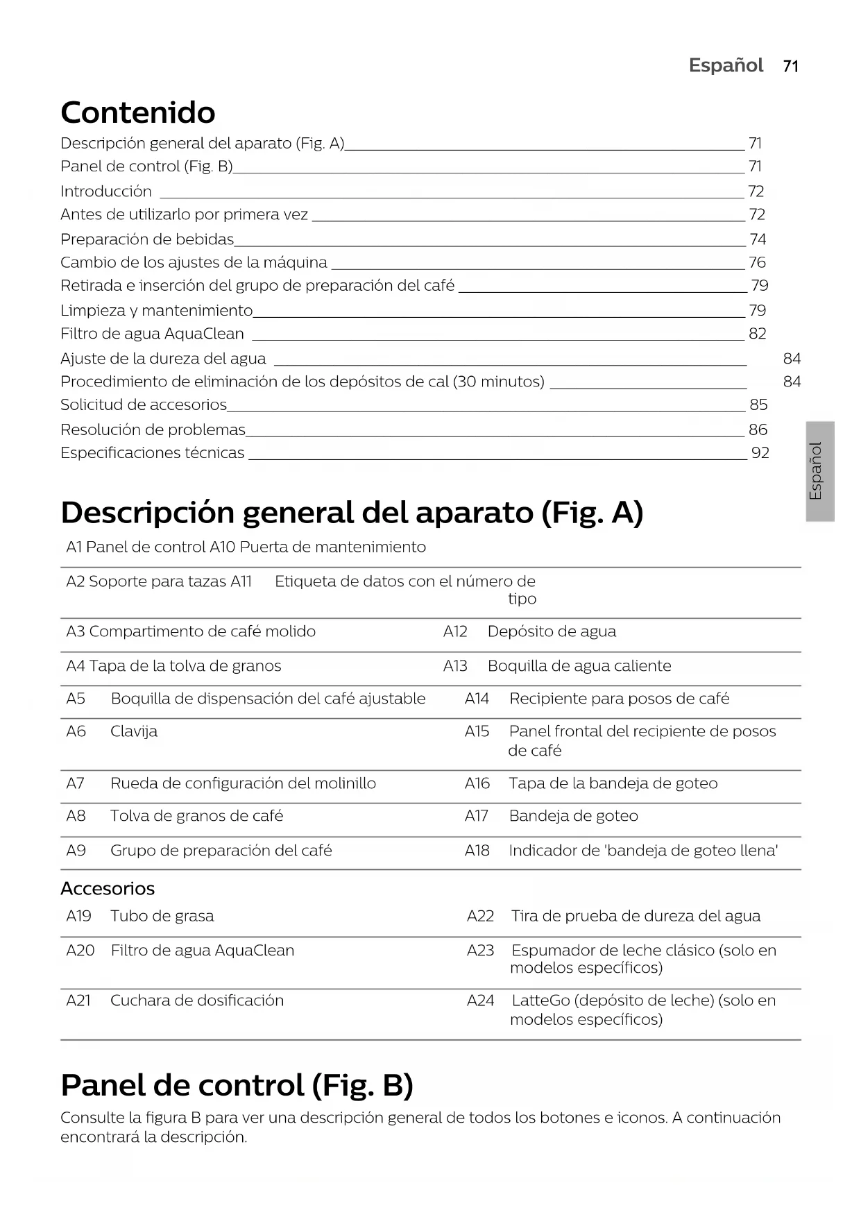 - Iconos de bebida: expreso, expreso largo, café, americano, capuchino, latte macchiato, agua caliente, vapor (solo en modelos específicos) Introducción ¡Enhorabuena por la adquisición de una cafetera totalmente automática Philips! Para sacar el mayor partido a la asistencia que Philips le ofrece, registre el producto en www.philips.com/welcome. Lea atentamente el librillo de seguridad separado antes de usar la máquina por primera vez y consérvelo por si necesitara consultarlo en el futuro. Para ayudarle a empezar y sacarle el máximo provecho al aparato, Philips le ofrece ayuda de muchas maneras. En la caja encontrará: 1 Este manual del usuario con instrucciones de uso con imágenes e información más detallada sobre la limpieza y el mantenimiento. Hay varias versiones de esta cafetera expreso, todas ellas con funciones distintas. Cada versión tiene un número de tipo. Puede encontrar el número de tipo en la etiqueta de datos que se encuentra dentro de la puerta de mantenimiento (consulte la Fig. A11). 2 El folleto de seguridad adjunto con instrucciones sobre cómo usar el aparato de forma segura. 3 Para obtener ayuda en línea (preguntas frecuentes, vídeos, etc.), escanee el código QR de la portada de este folleto o visite www.philips.com/coffee-care Este aparato se ha probado con café. Aunque se ha limpiado cuidadosamente, es posible que quede algún residuo de café. Le garantizamos, no obstante, que el aparato es absolutamente nuevo. El aparato ajusta automáticamente la cantidad de café molido que se utiliza para hacer un café con el mejor sabor. Debe preparar 5 cafés al principio para permitir que la máquina complete su ajuste automático. Asegúrese de enjuagar el LatteGo (el depósito de leche) o el espumador de leche clásico antes de utilizarlo por primera vez. Antes de utilizarlo por primera vez