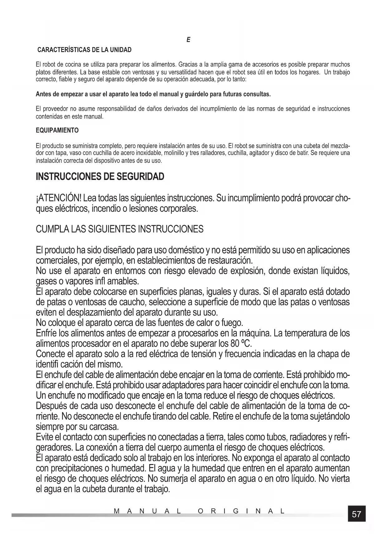 El producto ha sido diseñado para uso doméstico y no está permitido su uso en aplicaciones comerciales, por ejemplo, en establecimientos de restauración. No use el aparato en entornos con riesgo elevado de explosión, donde existan líquidos, gases o vapores infl amables. El aparato debe colocarse en superfi cies planas, iguales y duras. Si el aparato está dotado de patas o ventosas de caucho, seleccione a superfi cie de modo que las patas o ventosas eviten el desplazamiento del aparato durante su uso. No coloque el aparato cerca de las fuentes de calor o fuego. Enfríe los alimentos antes de empezar a procesarlos en la máquina. La temperatura de los alimentos procesador en el aparato no debe superar los 80 ºC. Conecte el aparato solo a la red eléctrica de tensión y frecuencia indicadas en la chapa de identifi cación del mismo. El enchufe del cable de alimentación debe encajar en la toma de corriente. Está prohibido mo- difi car el enchufe. Está prohibido usar adaptadores para hacer coincidir el enchufe con la toma. Un enchufe no modifi cado que encaje en la toma reduce el riesgo de choques eléctricos. Después de cada uso desconecte el enchufe del cable de alimentación de la toma de co- rriente. No desconecte el enchufe tirando del cable. Retire el enchufe de la toma sujetándolo siempre por su carcasa. Evite el contacto con superfi cies no conectadas a tierra, tales como tubos, radiadores y refri- geradores. La conexión a tierra del cuerpo aumenta el riesgo de choques eléctricos. El aparato está dedicado solo al trabajo en los interiores. No exponga el aparato al contacto con precipitaciones o humedad. El agua y la humedad que entren en el aparato aumentan el riesgo de choques eléctricos. No sumerja el aparato en agua o en otro líquido. No vierta el agua en la cubeta durante el trabajo.58 MANUAL ORIGINAL