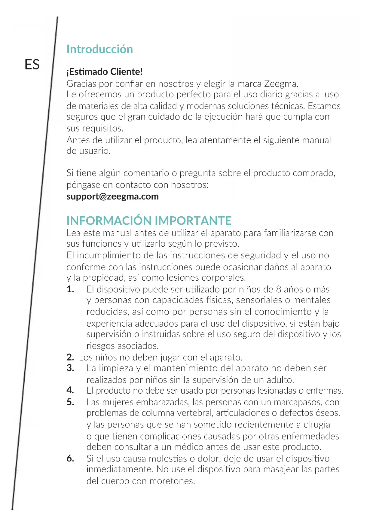 L’appareil doit être essuyé avec un chion humide et bien séché avant la prochaine ulisaon. Les photos ont le caractère indicaf seulement ; l’aspect réel des produits peut diérer de celui présenté sur les photos.ES Introducción ¡Esmado Cliente! Gracias por conar en nosotros y elegir la marca Zeegma. Le ofrecemos un producto perfecto para el uso diario gracias al uso de materiales de alta calidad y modernas soluciones técnicas. Estamos seguros que el gran cuidado de la ejecución hará que cumpla con sus requisitos. Antes de ulizar el producto, lea atentamente el siguiente manual de usuario. Si ene algún comentario o pregunta sobre el producto comprado, póngase en contacto con nosotros: support@zeegma.com