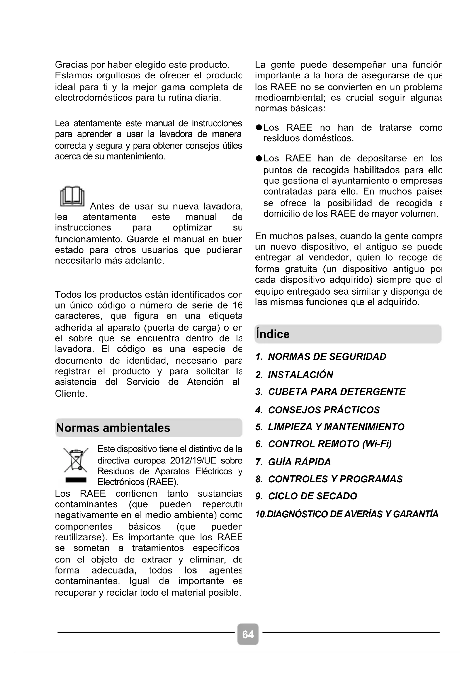 Lea atentamente este manual de instrucciones para aprender a usar la lavadora de manera correcta y segura y para obtener consejos útiles acerca de su mantenimiento.