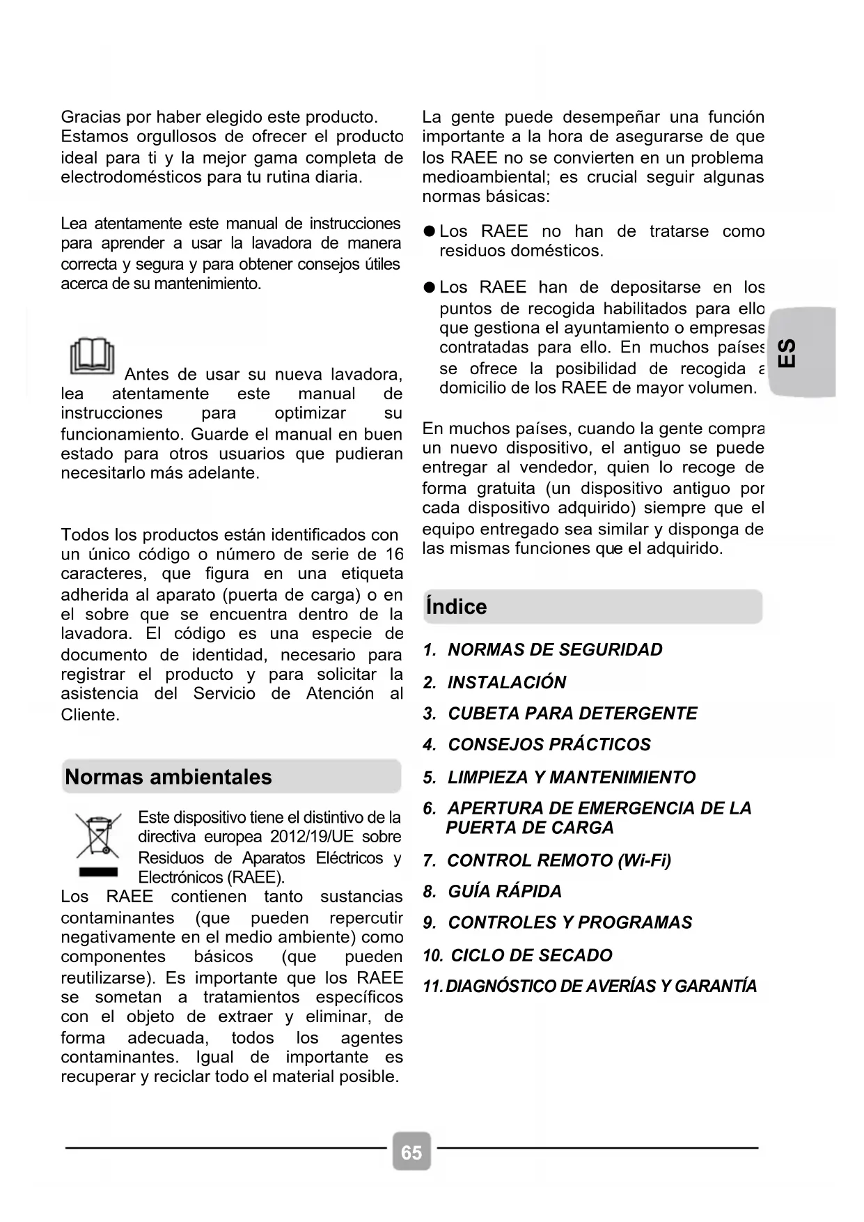 Lea atentamente este manual de instrucciones para aprender a usar la lavadora de manera correcta y segura y para obtener consejos útiles acerca de su mantenimiento.