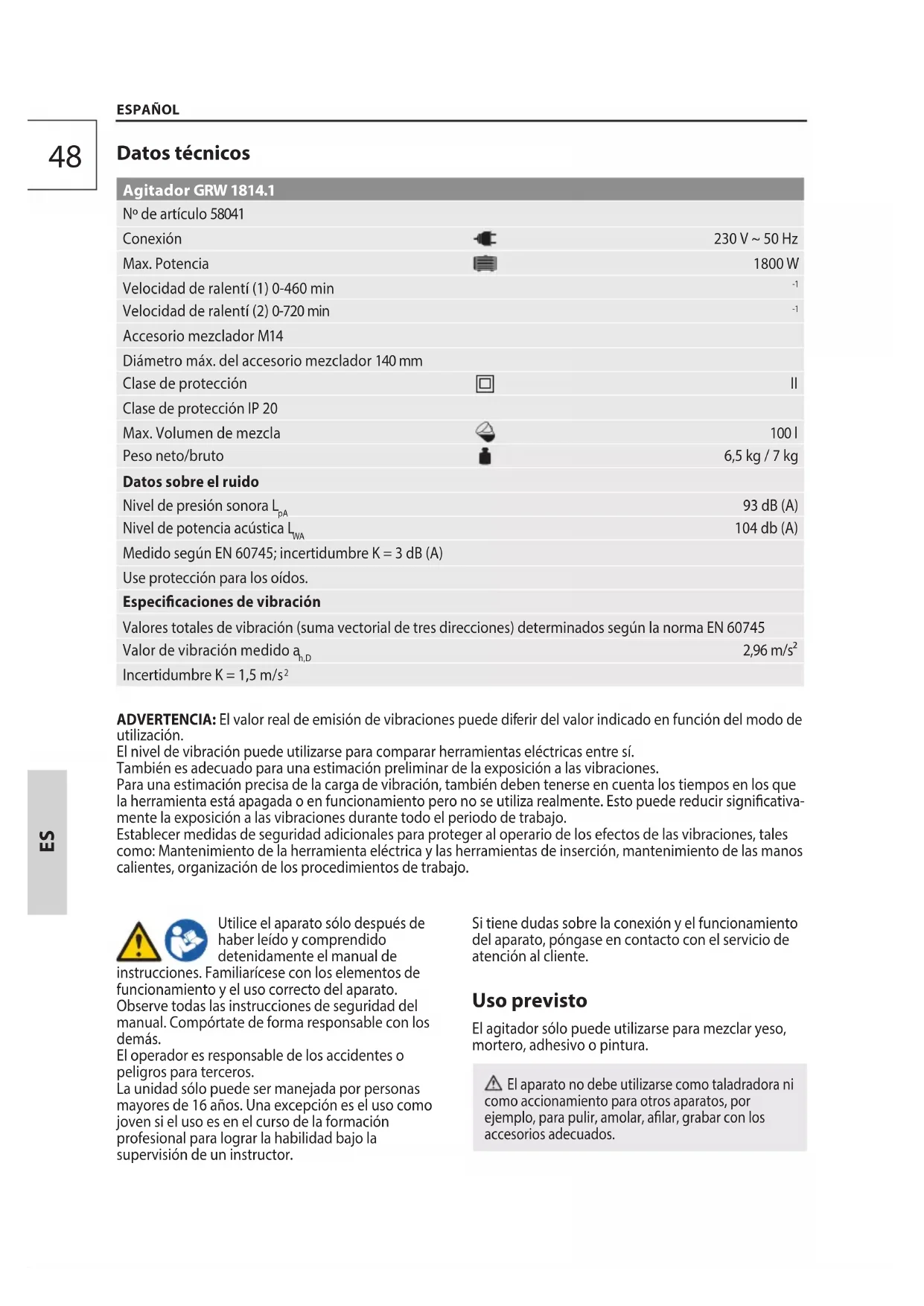 ADVERTENCIA: El valor real de emisión de vibraciones puede diferir del valor indicado en función del modo de utilización. El nivel de vibración puede utilizarse para comparar herramientas eléctricas entre sí. También es adecuado para una estimación preliminar de la exposición a las vibraciones. Para una estimación precisa de la carga de vibración, también deben tenerse en cuenta los tiempos en los que la herramienta está apagada o en funcionamiento pero no se utiliza realmente. Esto puede reducir signicativa- mente la exposición a las vibraciones durante todo el periodo de trabajo. Establecer medidas de seguridad adicionales para proteger al operario de los efectos de las vibraciones, tales como: Mantenimiento de la herramienta eléctrica y las herramientas de inserción, mantenimiento de las manos calientes, organización de los procedimientos de trabajo. Utilice el aparato sólo después de haber leído y comprendido detenidamente el manual de instrucciones. Familiarícese con los elementos de funcionamiento y el uso correcto del aparato. Observe todas las instrucciones de seguridad del manual. Compórtate de forma responsable con los demás. El operador es responsable de los accidentes o peligros para terceros. La unidad sólo puede ser manejada por personas mayores de 16 años. Una excepción es el uso como joven si el uso es en el curso de la formación profesional para lograr la habilidad bajo la supervisión de un instructor. Si tiene dudas sobre la conexión y el funcionamiento del aparato, póngase en contacto con el servicio de atención al cliente. Uso previsto El agitador sólo puede utilizarse para mezclar yeso, mortero, adhesivo o pintura. El aparato no debe utilizarse como taladradora ni como accionamiento para otros aparatos, por ejemplo, para pulir, amolar, alar, grabar con los accesorios adecuados.49
