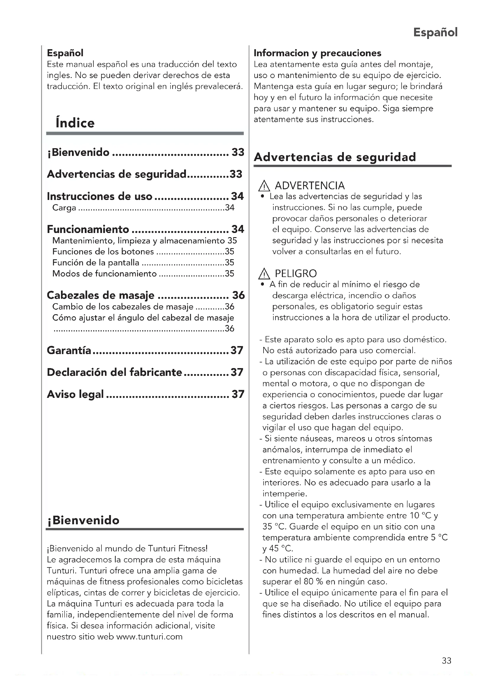 - No presione ni tire del aplicador en ángulo para evitar daños. Cabezal esférico grande de espuma Su diseño redondo esférico genera una potencia que se propaga y dispersa al recibir el masaje y hacer fuerza. La fuerza es uniforme y suave. Es adecuado para masajear y relajar la cintura, el abdomen, los glúteos y las piernas. También para relajar los músculos antes y después de practicar ejercicio, especialmente para los amantes del ejercicio suave, como baile, yoga, aerobic, etc. Cabezal plano pequeño de espuma Diseño pequeño y corto, en la base del plano tiene un pequeño arco que se adapta al mecanismo modelador del cuerpo y produce una sensación agradable. Apto para los músculos interiores y exteriores del abdomen, el pecho y las piernas. Cabezal tipo U La fuerza entre los dos puntos es uniforme, es estimulante y potente, lo que permite llevar a cabo con eficacia masajes simples de acupuntura. La anchura de la forma en U permite evitar la columna vertebral y las vértebras cervicales, lo que mejora la experiencia general. Adecuado para los hombros, las cervicales y los músculos bilaterales. (No se puede utilizar directamente sobre las vértebras cervicales ni de la columna, ya que puede provocar lesiones físicas). Cabezal cónico de espuma Una forma simple, de impacto directo, presión directa hasta lo más profundo. Apto para los meridianos, las plantas de los pies, las palmas, el tendón de Aquiles, los músculos romboides de la espalda, etc. Cabezal de absorción de impactos El cabezal de absorción de impactos se puede utilizar con los mismos fines que el cabezal esférico grande de espuma; sin embargo, incorpora absorción de impactos, por lo que es más adecuado para las partes sensibles del cuerpo. Cabezal de pala El cabezal de pala está diseñado para ser preciso en los puntos más estrechos, como entre los omóplatos o las pantorrillas. Cómo ajustar el ángulo del cabezal de masaje (Fig. E) - Mantenga pulsado el botón “A” situado debajo del inserto del cabezal de masaje para liberar la fijación de la posición del cabezal de masaje. - Coloque el cabezal de masaje en la posición deseada y suelte el botón. - Ajuste la posición de los cabezales de masaje hasta que se bloqueen.37 Español Garantía Garantía del cliente de Tunturi Condiciones de garantía El cliente tiene derecho a los beneficios jurídicos aplicables recogidos en la legislación nacional relativa al comercio de bienes de consumo. Esta garantía no restringe dichos beneficios. La garantía del cliente solamente será válida si se utiliza el producto en un entorno autorizado por Tunturi New Fitness BV para el equipo concreto. En el manual de uso incluido con su equipo se describe el entorno autorizado para el mismo. Condiciones de la garantía Las condiciones de la garantía se inician a partir de la fecha de compra. Es posible que las condiciones de la garantía varíen de un país a otro; consulte a su distribuidor local al respecto. Cobertura de la garantía Ni Tunturi New Fitness BV ni el distribuidor de Tunturi asumirán responsabilidad alguna en virtud de esta garantía o por otros motivos por daños especiales, indirectos, secundarios o derivados, sean del tipo que sean, provocados por el uso o la incapacidad para usar este equipo. La presente garantía excluye: - Daños derivados de accidentes, mala utilización, manipulación incorrecta o transporte; - Las unidades que no se utilicen conforme a estas instrucciones; - Los daños que superen el coste del producto; - El deterioro del producto entregado que sea resultado de unas condiciones anómalas de almacenamiento o cuidado en las instalaciones del cliente; - Productos cuya fecha de compra no se pueda acreditar. El incumplimiento de las instrucciones del manual de uso anulará la garantía del producto. Declaración del fabricante Tunturi New Fitness BV garantiza que el producto cumple las siguientes normas y directivas: EN 957 (HC), 2014/30/EU. Por consiguiente, el producto lleva la etiqueta CE. 06-2023 Tunturi New Fitness BV Purmerweg 1 1311 XE Almere Países Bajos Aviso legal © 2023 Tunturi New Fitness BV Todos los derechos reservados. - El producto y el manual están sujetos a cambios. - Las especificaciones pueden cambiarse sin previo aviso. - Consulte nuestra página web para descargar la versión del manual de usuario más reciente.38 Svenska På svenska Denna handbok är en översättning av den engelska texten. Vi förbehåller oss rätten till eventuella översättningsfel. Den engelska originaltexten råder. Index Välkommen Välkommen till Tunturi Fitness värld! Tack för att du köpte denna utrustning från Tunturi. Tunturi erbjuder ett stort utbud av professionell träningsutrustning, exempelvis crosstrainers, löpband, träningscyklar och roddmaskiner. Utrustning från Tunturi passar hela familjen, oavsett träningsnivå. Mer information finns på vår webbplats, www.tunturi.com Välkommen 38 Säkerhetsvarningar 38 Användningsinstruktioner 39 Laddning 39 Användning 39 Underhåll, rengöring och förvaring 39 Knappfunktioner 40 Displayfunktion 40 Arbetslägen 40 Massagehuvuden 41 Byta massagehuvuden 41 Justera massagehuvudets vinkel 41 Garanti 41 Deklaration från tillverkaren 42 Friskrivning 42 Viktiga instruktioner om säkerhet Läs noga igenom denna handbok innan du monterar,, använder eller reparerar ditt nya träningsredskap. Spara denna handbok; den innehåller information som du behöver nu och i framtiden för att använda och underhålla ditt redskap. Följ alltid dessa instruktioner noggrannt. Säkerhetsvarningar ⚠ VARNING