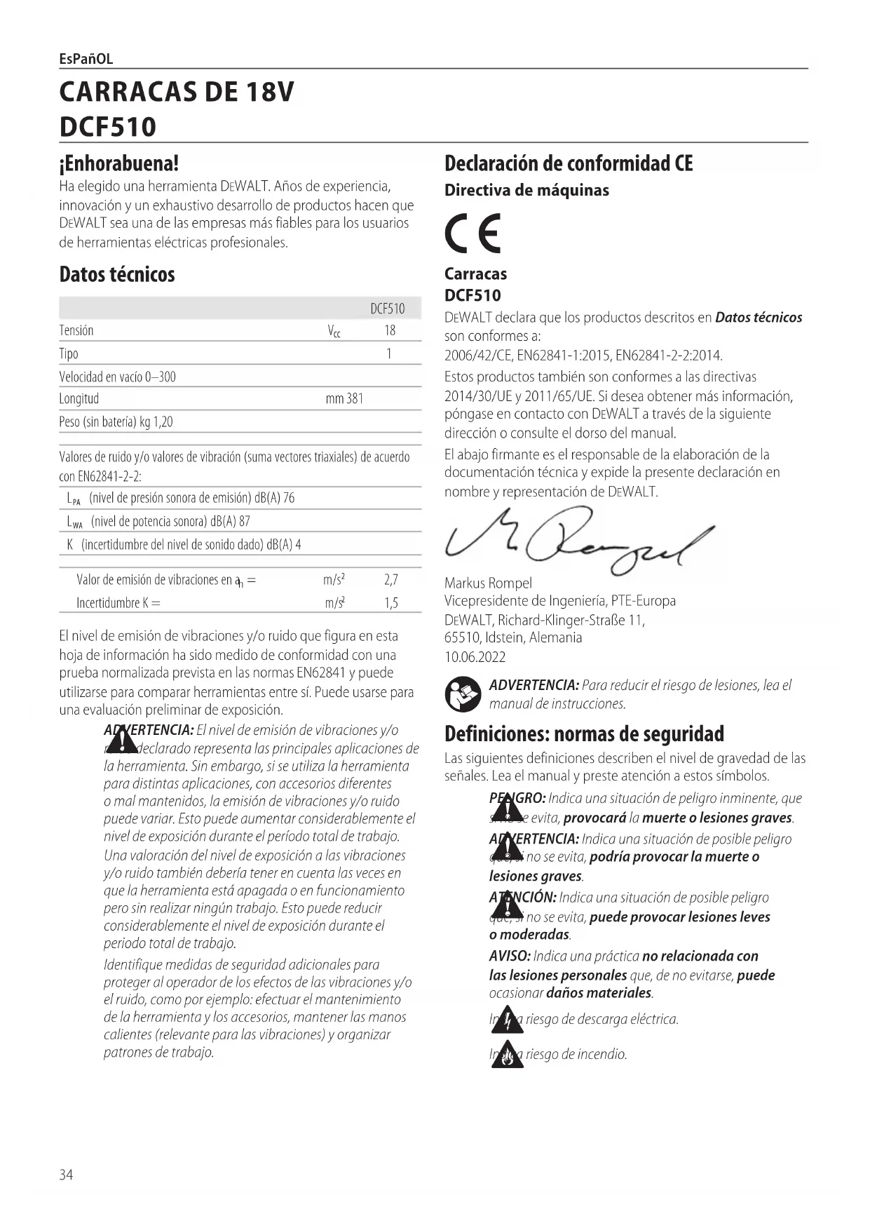 ADVERTENCIA: Indica una situación de posible peligro que, si no se evita, podría provocar la muerte o lesionesgraves. ATENCIÓN: Indica una situación de posible peligro que, si no se evita, puede provocar lesiones leves omoderadas. AVISO: Indica una práctica no relacionada con las lesiones personales que, de no evitarse, puede ocasionar dañosmateriales. Indica riesgo de descargaeléctrica. Indica riesgo deincendio. Declaración de conformidad CE Directiva de máquinas Carracas DCF510 DeWALT declara que los productos descritos en Datos técnicos son conformes a: 2006/42/CE, EN62841‑1:2015, EN62841‑2‑2:2014.Estos productos también son conformes a las directivas 2014/30/UE y 2011/65/UE. Si desea obtener más información, póngase en contacto con DeWALT a través de la siguiente dirección o consulte el dorso delmanual.El abajo firmante es el responsable de la elaboración de la documentación técnica y expide la presente declaración en nombre y representación deDeWALT.Markus Rompel Vicepresidente de Ingeniería, PTE‑Europa DeWALT, Richard‑Klinger‑Straße 11, 65510, Idstein, Alemania 10.06.2022El nivel de emisión de vibraciones y/o ruido que figura en esta hoja de información ha sido medido de conformidad con una prueba normalizada prevista en las normas 62841 y puede utilizarse para comparar herramientas entre sí. Puede usarse para una evaluación preliminar deexposición. ADVERTENCIA: El nivel de emisión de vibraciones y/o ruido declarado representa las principales aplicaciones de la herramienta. Sin embargo, si se utiliza la herramienta para distintas aplicaciones, con accesorios diferentes o mal mantenidos, la emisión de vibraciones y/o ruido puede variar. Esto puede aumentar considerablemente el nivel de exposición durante el período total detrabajo.Una valoración del nivel de exposición a las vibraciones y/o ruido también debería tener en cuenta las veces en que la herramienta está apagada o en funcionamiento pero sin realizar ningún trabajo. Esto puede reducir considerablemente el nivel de exposición durante el periodo total detrabajo.Identifique medidas de seguridad adicionales para proteger al operador de los efectos de las vibraciones y/o el ruido, como por ejemplo: efectuar el mantenimiento de la herramienta y los accesorios, mantener las manos calientes (relevante para las vibraciones) y organizar patrones detrabajo.DCF510Tensión