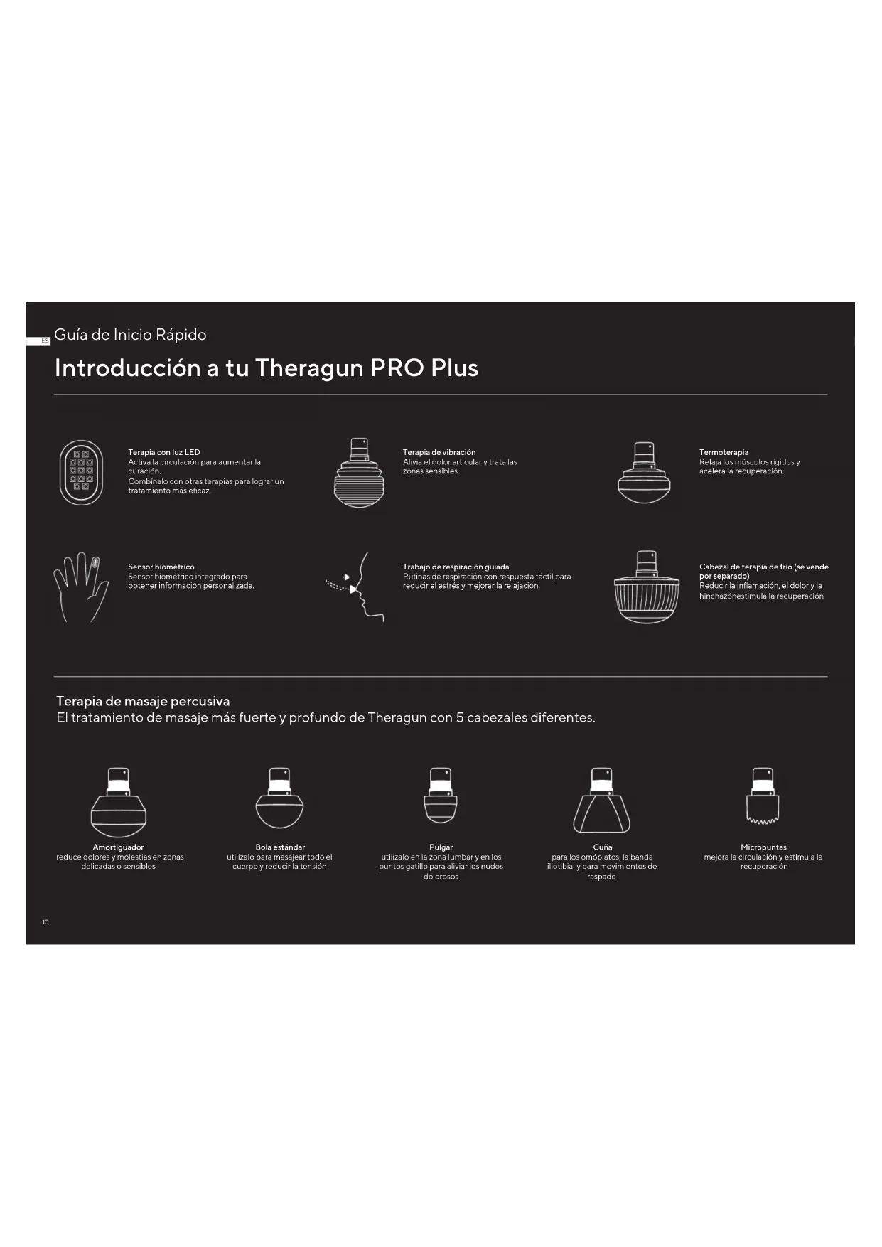 - The battery life of the Theragun PRO Plus device is approximately 120 minutes. **Note: If using an alternative USB-C cable, ensure that it is from a trusted source and has not suered any structural damage. Do not try to use the device while charging. See Warnings insert for important safety instructions Intended Use Percussive Massage Therapy Relieve aches and pains, improve performance, enhance recovery, and improve flexibility. Infrared LED Light Therapy Stimulate circulation to boost healing. Combine with other therapies for a more eective treatment. Vibration Therapy Relieve joint pain and treat sensitive areas. Heat Therapy Loosen up sti muscles and accelerate recovery. Biometric Sensor Built-in biometric sensor for personalized insights. Guided Breathwork Haptic-lead breathing routines to reduce stress and improve relaxation. Cold Therapy (sold separately) Reduce inflammation, pain, and swelling.Introducción a tu Theragun PRO Plus Guía de Inicio Rápido Terapia de masaje percusiva El tratamiento de masaje más fuerte y profundo de Theragun con 5 cabezales diferentes. Sensor biométrico Sensor biométrico integrado para obtener información personalizada. Terapia con luz LED Activa la circulación para aumentar la curación. Combínalo con otras terapias para lograr un tratamiento más ecaz. Trabajo de respiración guiada Rutinas de respiración con respuesta táctil para reducir el estrés y mejorar la relajación. Terapia de vibración Alivia el dolor articular y trata las zonas sensibles. Termoterapia Relaja los músculos rígidos y acelera la recuperación. Cabezal de terapia de frío (se vende por separado) Reducir la inflamación, el dolor y la hinchazónestimula la recuperación Amortiguador reduce dolores y molestias en zonas delicadas o sensibles Bola estándar utilízalo para masajear todo el cuerpo y reducir la tensión Pulgar utilízalo en la zona lumbar y en los puntos gatillo para aliviar los nudos dolorosos Cuña para los omóplatos, la banda iliotibial y para movimientos de raspado Micropuntas mejora la circulación y estimula la recuperación