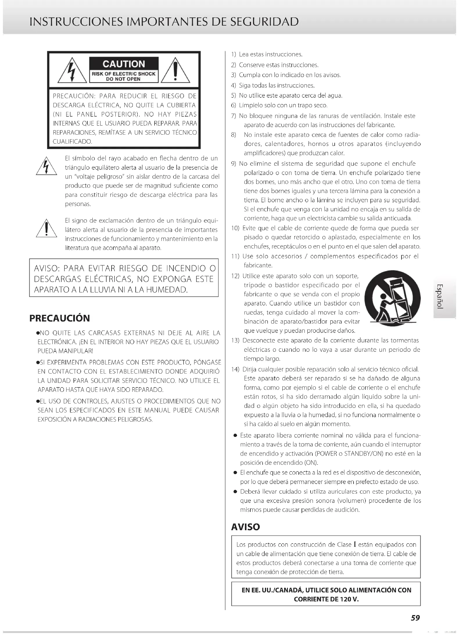 PRECAUCIÓN: PARA REDUCIR EL RIESGO DE DESCARGA ELÉCTRICA, NO QUITE LA CUBIERTA (NI EL PANEL POSTERIOR). NO HAY PIEZAS INTERNAS QUE EL USUARIO PUEDA REPARAR. PARA REPARACIONES, REMÍTASE A UN SERVICIO TÉCNICO CUALIFICADO. El símbolo del rayo acabado en flecha dentro de un triángulo equilátero alerta al usuario de la presencia de un “voltaje peligroso” sin aislar dentro de la carcasa del producto que puede ser de magnitud suficiente como para constituir riesgo de descarga eléctrica para las personas. El signo de exclamación dentro de un triángulo equi-látero alerta al usuario de la presencia de importantes instrucciones de funcionamiento y mantenimiento en la literatura que acompaña al aparato. AVISO: PARA EVITAR RIESGO DE INCENDIO O