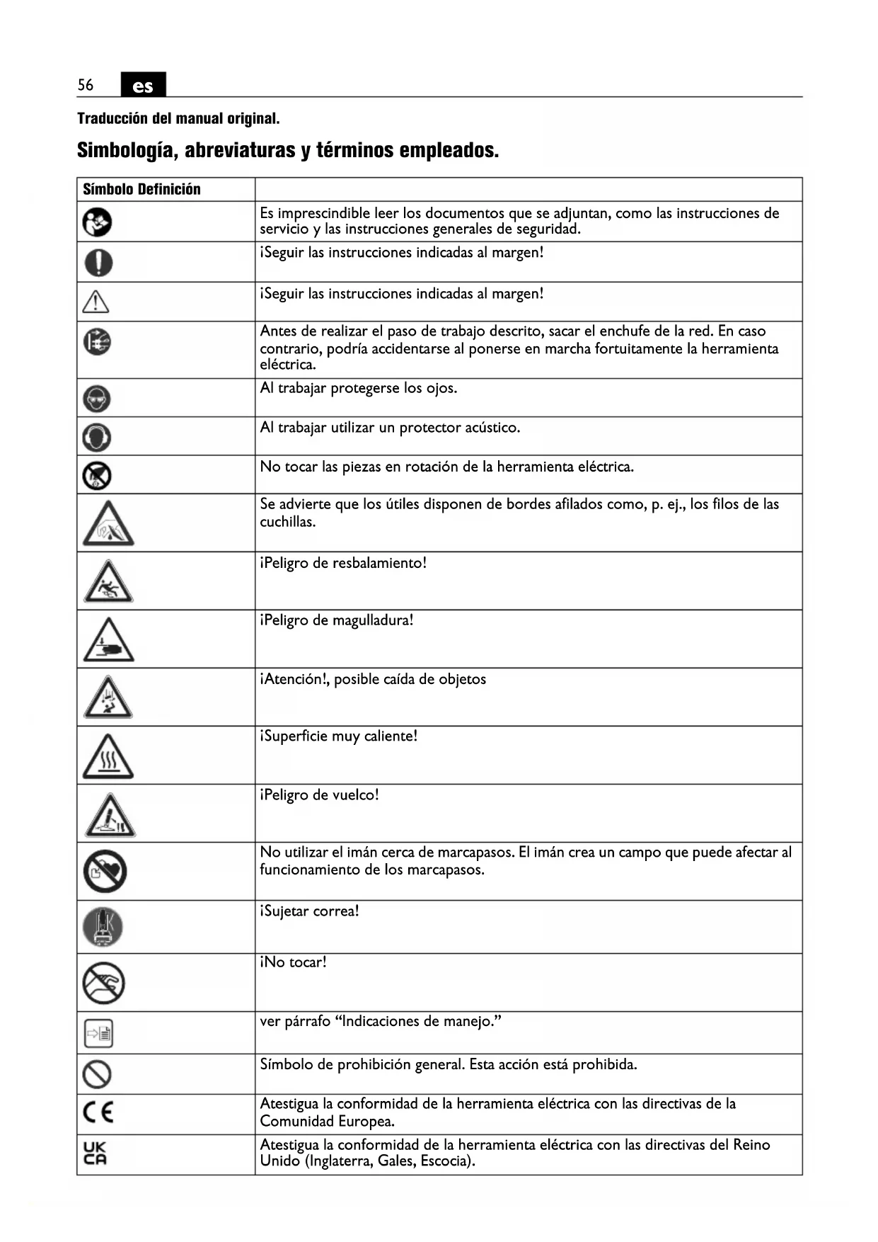 Traducción del manual original. Simbología, abreviaturas y términos empleados. Símbolo Definición Es imprescindible leer los documentos que se adjuntan, como las instrucciones de servicio y las instrucciones generales de seguridad. ¡Seguir las instrucciones indicadas al margen! ¡Seguir las instrucciones indicadas al margen! Antes de realizar el paso de trabajo descrito, sacar el enchufe de la red. En caso contrario, podría accidentarse al ponerse en marcha fortuitamente la herramienta eléctrica. Al trabajar protegerse los ojos. Al trabajar utilizar un protector acústico. No tocar las piezas en rotación de la herramienta eléctrica. Se advierte que los útiles disponen de bordes afilados como, p. ej., los filos de las cuchillas. ¡Peligro de resbalamiento! ¡Peligro de magulladura! ¡Atención!, posible caída de objetos ¡Superficie muy caliente! ¡Peligro de vuelco! No utilizar el imán cerca de marcapasos. El imán crea un campo que puede afectar al funcionamiento de los marcapasos. ¡Sujetar correa! ¡No tocar! ver párrafo “Indicaciones de manejo.” Símbolo de prohibición general. Esta acción está prohibida. Atestigua la conformidad de la herramienta eléctrica con las directivas de la Comunidad Europea. Atestigua la conformidad de la herramienta eléctrica con las directivas del Reino Unido (Inglaterra, Gales, Escocia).57