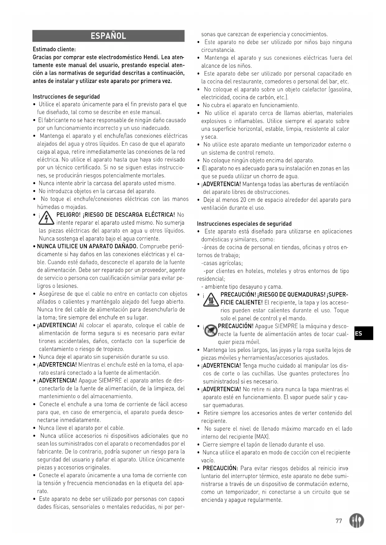 ESPAÑOL Estimado cliente: Gracias por comprar este electrodoméstico Hendi. Lea aten