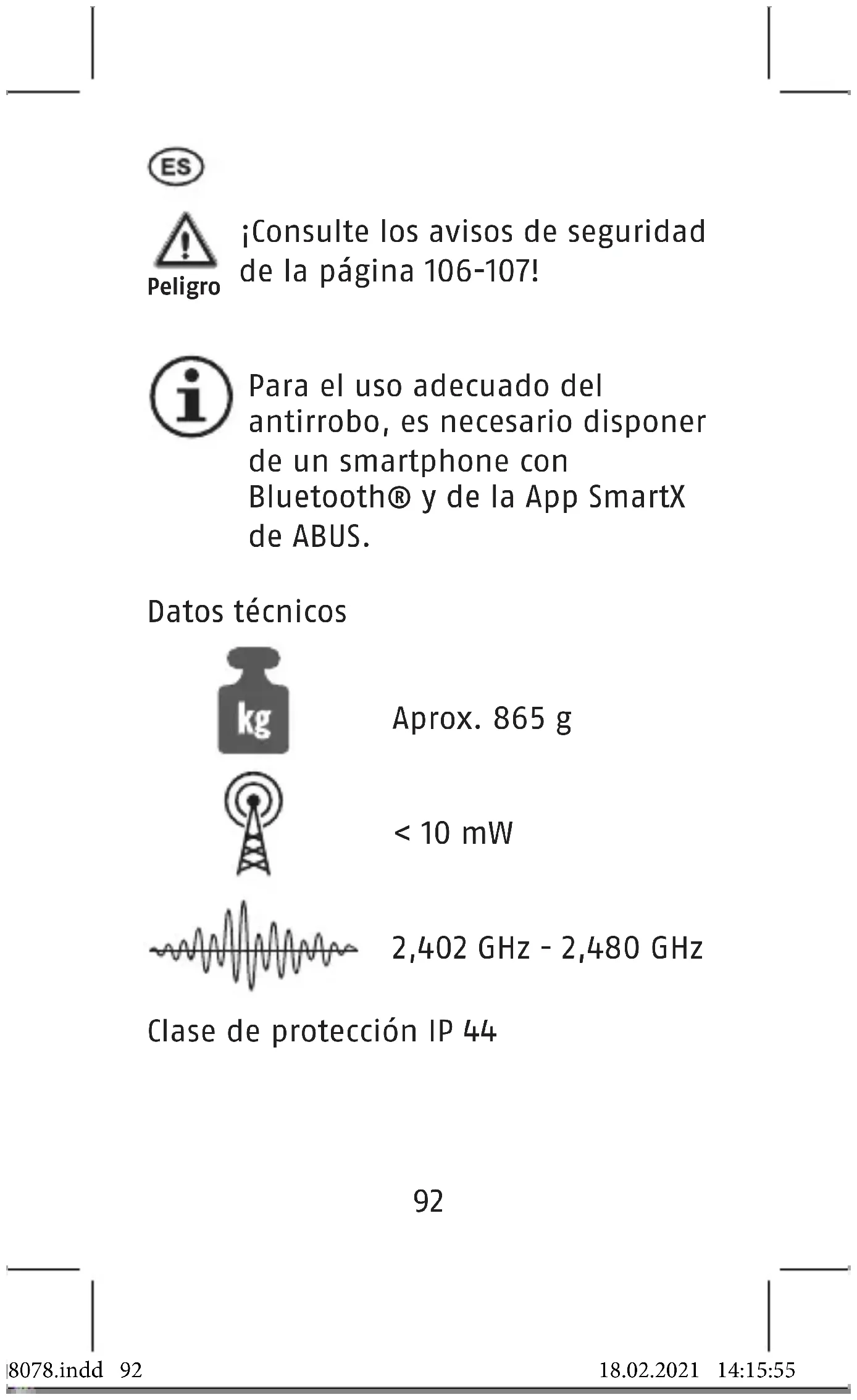¡No trans- porte el an- tirrobo en el exterior de la moto- cicleta! 8078.indd 1048078.indd 104 18.02.2021 14:16:0018.02.2021 14:16:00105 Carga de la batería Puede consultar el nivel de carga de la batería en la app SmartX. Cargue su antirrobo 8078 cuando la app se lo indique. ¡Cuando la batería está descargada, el antirrobo no se puede abrir ni cerrar! Proceso de carga >> 1.1 - 1.2 teniendo en cuenta los avisos de seguridad de la página 106-107. 8078.indd 1058078.indd 105 18.02.2021 14:16:0018.02.2021 14:16:00106 Avisos de seguridad sobre la batería de iones de litio y la pila de botón de litio CR2032 Este producto contiene una batería de iones de litio y una pila de botón de litio. No es necesario sustituir la batería y, en caso cont- rario, el fabricante (ABUS) deberá autorizarlo. Lea atentamente estos avisos de seguridad y téngalos en cuenta en todo momento. El incumplimiento podría provocar un incendio y/o causar daños personales y materiales. - No almacene ni utilice el producto en espa- cios cuyas temperaturas no superen los -20 °C o sean superiores a +40 °C. El pro- ducto no debe permanecer expuesto a la luz del sol durante un periodo de tiempo prolongado. - No cargue ni utilice el producto en entornos con peligro de explosión, p. ej., por la pre- sencia de líquidos, gases o polvo ina- mable. - No intente bajo ningún concepto abrir el producto y extraer la batería. Podrían producirse daños (expulsión de gases de la batería, cortocircuito, etc.) - La batería y las pilas no deben estar al alcance de los niños. Podrían llevárselas a la boca y atragantarse. Esto podría provocar daños graves para la salud. Si esto ocurre, Peligro Atención 8078.indd 1068078.indd 106 18.02.2021 14:16:0018.02.2021 14:16:00107 busque atención médica inmediatamente. - Una batería defectuosa puede irritar las vías respiratorias, la piel y los ojos. En este caso, lave inmediatamente la zona afectada con agua y busque atención médica. El líquido que contiene la batería es ina- mable. - La batería solo debe cargarse si la carcasa del antirrobo se encuentra en perfecto estado. No cargue la batería si el antirrobo presenta daños visibles, p. ej., grietas o agujeros. - Para la carga, utilice únicamente el cable USB suministrado en combinación con un cargador adecuado (fuente de alimentación de 5 V CC, corriente mínima de 500 mA). Vigile el antirrobo en todo momento duran- te la carga. - No acerque el producto a una fuente de ignición. La batería y la pila pueden explo- tar si se exponen al fuego. Además, emite sustancias nocivas en caso de calentamien- to. Indicaciones generales de seguridad - No utilice limpiadores a alta presión ni detergentes agresivos para limpiar el antirrobo. - Compruebe al menos una vez al año si el antirrobo presenta daños. El antirrobo no debe volver a utilizarse si presenta daños Atención 8078.indd 1078078.indd 107 18.02.2021 14:16:0018.02.2021 14:16:00108 WEEE-Reg.-Nr. DE79663011 visibles, p. ej., grietas o agujeros. Declaración de conformidad Por la presente, ABUS August Bremicker Söhne KG, Altenhofer Weg 25, 58300 Wetter, declara que el tipo de equipo radioeléctrico 8078 cumple con los requisitos esenciales y otras disposiciones relevantes de la Directiva 2014/53/UE cuando se utiliza según lo previsto. El texto íntegro de la declaración UE de conformidad está disponible en la siguiente dirección de Inter- net: www.abus.com. Eliminación En caso de que el antirrobo esté dañado o si no lo necesita más, no lo tire a la basura doméstica. Deseche el aparato conforme a lo establecido en la directiva eu- ropea 2012/19/EU sobre residuos de aparatos eléctricos y electrónicos (RAEE). Diríjase a la autoridad local competente para cualquier consulta al respecto. Los servicios municipa- les, la empresa de recogida de basura o su distribuidor pondrán a su disposición centros de recogida. Reservado el derecho a modicaciones técni- cas. No nos hacemos responsables de errores y fallos de impresión. 8078.indd 1088078.indd 108 18.02.2021 14:16:0018.02.2021 14:16:00109 8078.indd 1098078.indd 109 18.02.2021 14:16:0018.02.2021 14:16:00110 Se sikkerhedshenvisningerne på side 124-125! En Bluetooth®-kompatibel smartphone samt ABUS SmartX appen er nødvendig til korrekt betjening af låsen. Tekniske data Kapslingsklasse IP 44 ca. 865 g < 10 mW 2,402 GHz - 2,480 GHz Fare 8078.indd 1108078.indd 110 18.02.2021 14:16:0318.02.2021 14:16:03111 For at du kan bruge låsen, skal batteriet først være helt opladet. Vær opmærksom på sikkerheds- henvisningerne!