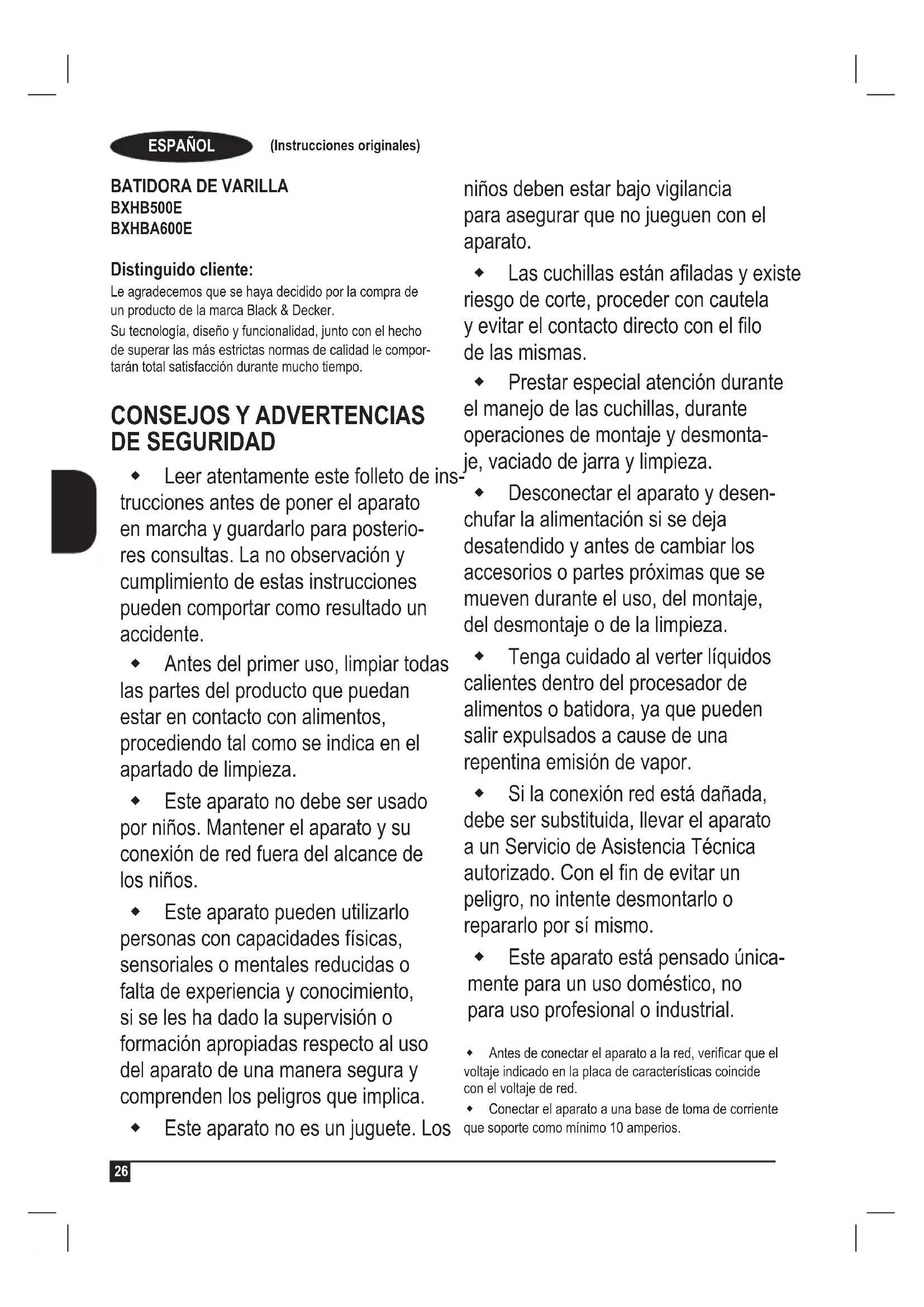 BXHB500E BXHBA600E Distinguido cliente: Le agradecemos que se haya decidido por la compra de un producto de la marca Black & Decker. Su tecnología, diseño y funcionalidad, junto con el hecho de superar las más estrictas normas de calidad le compor- tarán total satisfacción durante mucho tiempo.