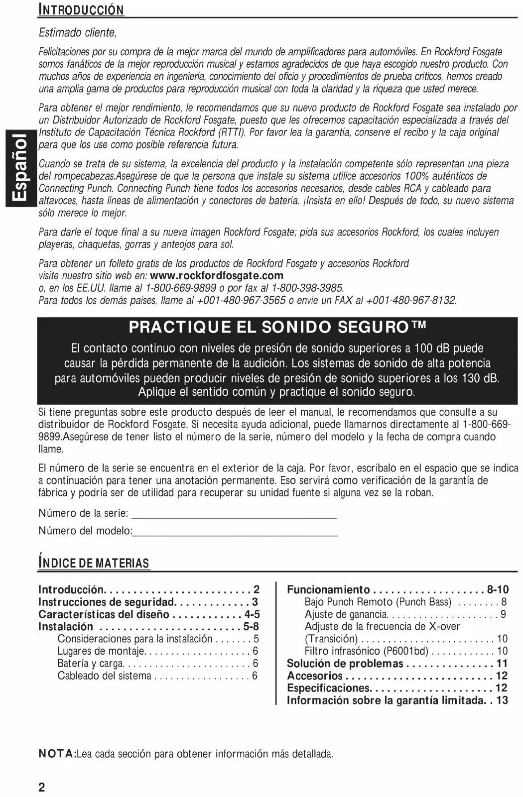 - El contacto continuo con niveles de presión de sonido superiores a 100 dB puede causar la pérdida permanente de la audición. Los sistemas de sonido de alta potencia para automóviles pueden producir niveles de presión de sonido superiores a los 130 dB. Aplique el sentido común y practique el sonido seguro. NOTA:Lea cada sección para obtener información más detallada. Si tiene preguntas sobre este producto después de leer el manual, le recomendamos que consulte a su distribuidor de Rockford Fosgate. Si necesita ayuda adicional, puede llamarnos directamente al 1-800-669- 9899.Asegúrese de tener listo el número de la serie, número del modelo y la fecha de compra cuando llame. El número de la serie se encuentra en el exterior de la caja. Por favor, escríbalo en el espacio que se indica a continuación para tener una anotación permanente. Eso servirá como verificación de la garantía de fábrica y podría ser de utilidad para recuperar su unidad fuente si alguna vez se la roban. Número de la serie: __________________________________ Número del modelo:__________________________________ Introducción p. 2