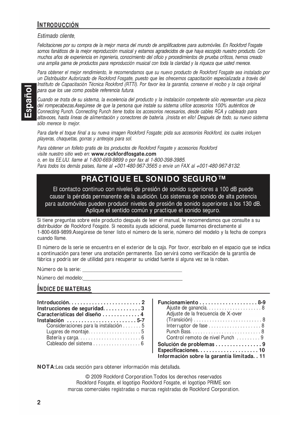 - El contacto continuo con niveles de presión de sonido superiores a 100 dB puede causar la pérdida permanente de la audición. Los sistemas de sonido de alta potencia para automóviles pueden producir niveles de presión de sonido superiores a los 130 dB. Aplique el sentido común y practique el sonido seguro. NOTA:Lea cada sección para obtener información más detallada. Si tiene preguntas sobre este producto después de leer el manual, le recomendamos que consulte a su distribuidor de Rockford Fosgate. Si necesita ayuda adicional, puede llamarnos directamente al 1-800-669-9899.Asegúrese de tener listo el número de la serie, número del modelo y la fecha de compra cuando llame. El número de la serie se encuentra en el exterior de la caja. Por favor, escríbalo en el espacio que se indica a continuación para tener una anotación permanente. Eso servirá como verificación de la garantía de fábrica y podría ser de utilidad para recuperar su unidad fuente si alguna vez se la roban. Número de la serie: __________________________________ Número del modelo:__________________________________ Introducción p. 2