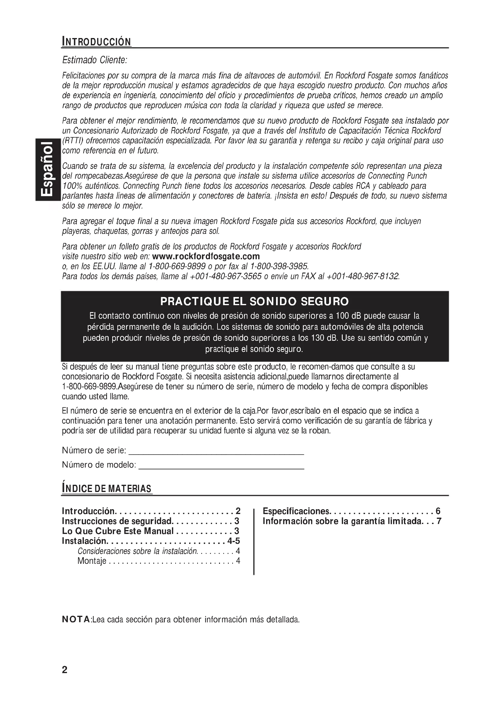 Estimado Cliente: Felicitaciones por su compra de la marca más fina de altavoces de automóvil. En Rockford Fosgate somos fanáticos de la mejor reproducción musical y estamos agradecidos de que haya escogido nuestro producto. Con muchos años de experiencia en ingeniería, conocimiento del oficio y procedimientos de prueba críticos, hemos creado un amplio rango de productos que reproducen música con toda la claridad y riqueza que usted se merece. Para obtener el mejor rendimiento, le recomendamos que su nuevo producto de Rockford Fosgate sea instalado por un Concesionario Autorizado de Rockford Fosgate, ya que a través del Instituto de Capacitación Técnica Rockford (RTTI) ofrecemos capacitación especializada. Por favor lea su garantía y retenga su recibo y caja original para uso como referencia en el futuro. Cuando se trata de su sistema, la excelencia del producto y la instalación competente sólo representan una pieza del rompecabezas.Asegúrese de que la persona que instale su sistema utilice accesorios de Connecting Punch 100% auténticos. Connecting Punch tiene todos los accesorios necesarios. Desde cables RCA y cableado para parlantes hasta líneas de alimentación y conectores de batería. ¡Insista en esto! Después de todo, su nuevo sistema sólo se merece lo mejor. Para agregar el toque final a su nueva imagen Rockford Fosgate pida sus accesorios Rockford, que incluyen playeras, chaquetas, gorras y anteojos para sol. Para obtener un folleto gratis de los productos de Rockford Fosgate y accesorios Rockford visite nuestro sitio web en: www.rockfordfosgate.com o, en los EE.UU. llame al 1-800-669-9899 o por fax al 1-800-398-3985. Para todos los demás países, llame al +001-480-967-3565 o envíe un FAX al +001-480-967-8132.