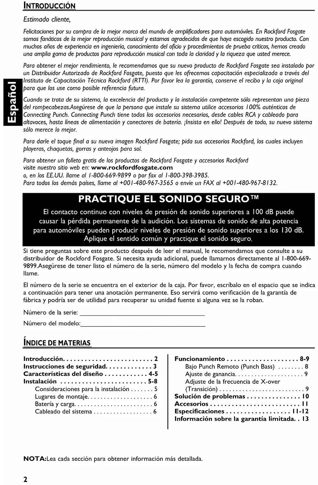 - NOTA:Lea cada sección para obtener información más detallada. Si tiene preguntas sobre este producto después de leer el manual, le recomendamos que consulte a su distribuidor de Rockford Fosgate. Si necesita ayuda adicional, puede llamarnos directamente al 1-800-669- 9899.Asegúrese de tener listo el número de la serie, número del modelo y la fecha de compra cuando llame. El número de la serie se encuentra en el exterior de la caja. Por favor, escríbalo en el espacio que se indica a continuación para tener una anotación permanente. Eso servirá como verificación de la garantía de fábrica y podría ser de utilidad para recuperar su unidad fuente si alguna vez se la roban. Número de la serie: __________________________________ Número del modelo:__________________________________ Introducción p. 2