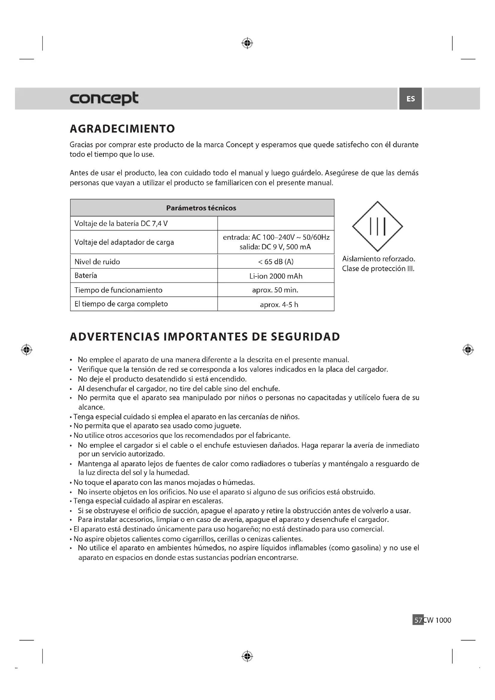 - Riciclare imballi e prodotti vecchi, alla fine di loro ciclo di vita.AGRADECIMIENTO Gracias por comprar este producto de la marca Concept y esperamos que quede satisfecho con él durante todo el tiempo que lo use. Antes de usar el producto, lea con cuidado todo el manual y luego guárdelo. Asegúrese de que las demás personas que vayan a utilizar el producto se familiaricen con el presente manual. Parámetros técnicos Voltaje de la batería DC 7,4 V Voltaje del adaptador de carga entrada: AC 100–240V ~ 50/60Hz salida: DC 9 V, 500 mA Nivel de ruido < 65 dB (A) Batería Li-ion 2000 mAh Tiempo de funcionamiento aprox. 50 min. El tiempo de carga completo aprox. 4-5 h