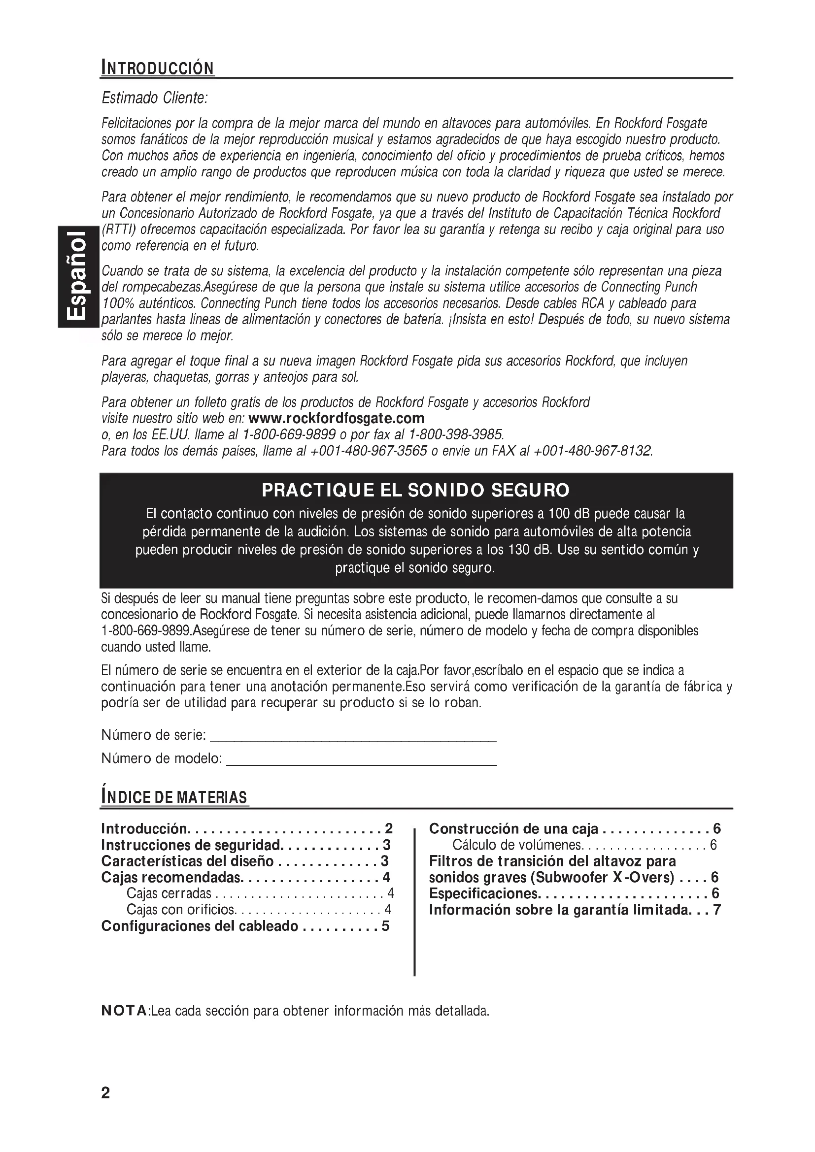 - El contacto continuo con niveles de presión de sonido superiores a 100 dB puede causar la pérdida permanente de la audición. Los sistemas de sonido para automóviles de alta potencia pueden producir niveles de presión de sonido superiores a los 130 dB. Use su sentido común y practique el sonido seguro. NOTA:Lea cada sección para obtener información más detallada. Si después de leer su manual tiene preguntas sobre este producto, le recomen-damos que consulte a su concesionario de Rockford Fosgate. Si necesita asistencia adicional, puede llamarnos directamente al 1-800-669-9899.Asegúrese de tener su número de serie, número de modelo y fecha de compra disponibles cuando usted llame. El número de serie se encuentra en el exterior de la caja.Por favor,escríbalo en el espacio que se indica a continuación para tener una anotación permanente.Eso servirá como verificación de la garantía de fábrica y podría ser de utilidad para recuperar su producto si se lo roban. Número de serie: ____________________________________ Número de modelo: __________________________________ Introducción p. 2