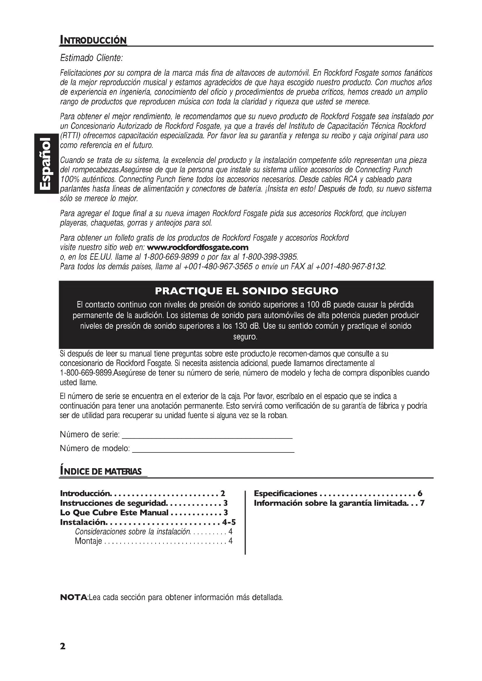 Estimado Cliente: Felicitaciones por su compra de la marca más fina de altavoces de automóvil. En Rockford Fosgate somos fanáticos de la mejor reproducción musical y estamos agradecidos de que haya escogido nuestro producto. Con muchos años de experiencia en ingeniería, conocimiento del oficio y procedimientos de prueba críticos, hemos creado un amplio rango de productos que reproducen música con toda la claridad y riqueza que usted se merece. Para obtener el mejor rendimiento, le recomendamos que su nuevo producto de Rockford Fosgate sea instalado por un Concesionario Autorizado de Rockford Fosgate, ya que a través del Instituto de Capacitación Técnica Rockford (RTTI) ofrecemos capacitación especializada. Por favor lea su garantía y retenga su recibo y caja original para uso como referencia en el futuro. Cuando se trata de su sistema, la excelencia del producto y la instalación competente sólo representan una pieza del rompecabezas.Asegúrese de que la persona que instale su sistema utilice accesorios de Connecting Punch 100% auténticos. Connecting Punch tiene todos los accesorios necesarios. Desde cables RCA y cableado para parlantes hasta líneas de alimentación y conectores de batería. ¡Insista en esto! Después de todo, su nuevo sistema sólo se merece lo mejor. Para agregar el toque final a su nueva imagen Rockford Fosgate pida sus accesorios Rockford, que incluyen playeras, chaquetas, gorras y anteojos para sol. Para obtener un folleto gratis de los productos de Rockford Fosgate y accesorios Rockford visite nuestro sitio web en: www.rockfordfosgate.com o, en los EE.UU. llame al 1-800-669-9899 o por fax al 1-800-398-3985. Para todos los demás países, llame al +001-480-967-3565 o envíe un FAX al +001-480-967-8132.