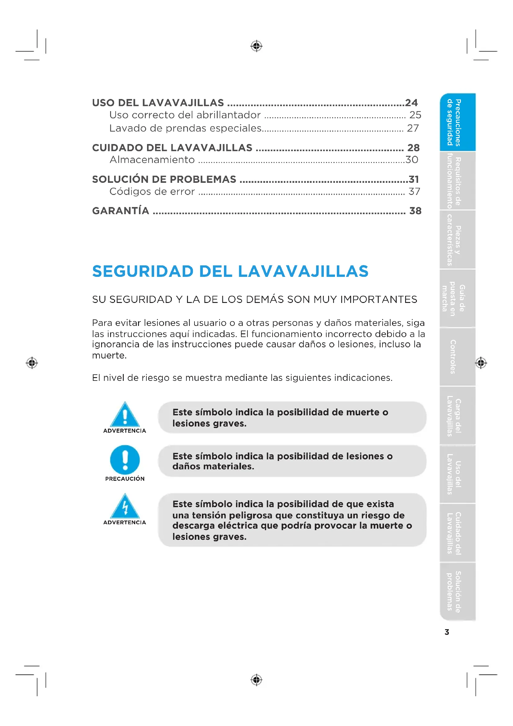 bandeja.31 Precauciones de seguridad Requisitos de funcionamiento Piezas y características Guía de puesta en marcha Controles Carga del Lavavajillas Uso del Lavavajillas Cuidado del Lavavajillas Solución de problemas