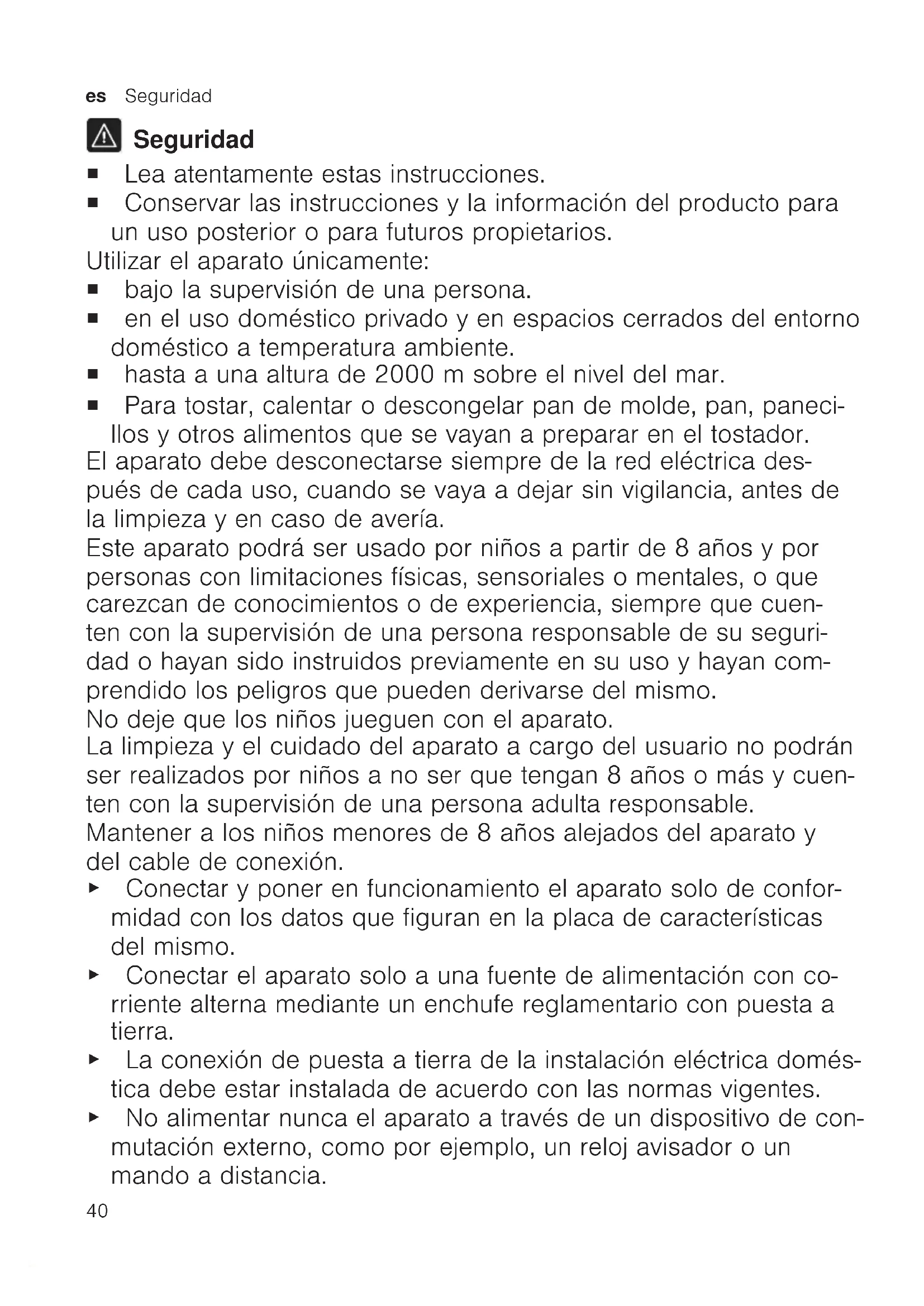Seguridad ¡ Lea atentamente estas instrucciones. ¡ Conservar las instrucciones y la información del producto para un uso posterior o para futuros propietarios. Utilizar el aparato únicamente: ¡ bajo la supervisión de una persona. ¡ en el uso doméstico privado y en espacios cerrados del entorno doméstico a temperatura ambiente. ¡ hasta a una altura de 2000msobre el nivel del mar. ¡ Para tostar, calentar o descongelar pan de molde, pan, paneci- llos y otros alimentos que se vayan a preparar en el tostador. El aparato debe desconectarse siempre de la red eléctrica des- pués de cada uso, cuando se vaya a dejar sin vigilancia, antes de la limpieza y en caso de avería. Este aparato podrá ser usado por niños a partir de 8 años y por personas con limitaciones físicas, sensoriales o mentales, o que carezcan de conocimientos o de experiencia, siempre que cuen- ten con la supervisión de una persona responsable de su seguri- dad o hayan sido instruidos previamente en su uso y hayan com- prendido los peligros que pueden derivarse del mismo. No deje que los niños jueguen con el aparato. La limpieza y el cuidado del aparato a cargo del usuario no podrán ser realizados por niños a no ser que tengan 8 años o más y cuen- ten con la supervisión de una persona adulta responsable. Mantener a los niños menores de 8 años alejados del aparato y del cable de conexión. ▶ Conectar y poner en funcionamiento el aparato solo de confor- midad con los datos que figuran en la placa de características del mismo. ▶ Conectar el aparato solo a una fuente de alimentación con co- rriente alterna mediante un enchufe reglamentario con puesta a tierra. ▶ La conexión de puesta a tierra de la instalación eléctrica domés- tica debe estar instalada de acuerdo con las normas vigentes. ▶ No alimentar nunca el aparato a través de un dispositivo de con- mutación externo, como por ejemplo, un reloj avisador o un mando a distancia.Seguridad es