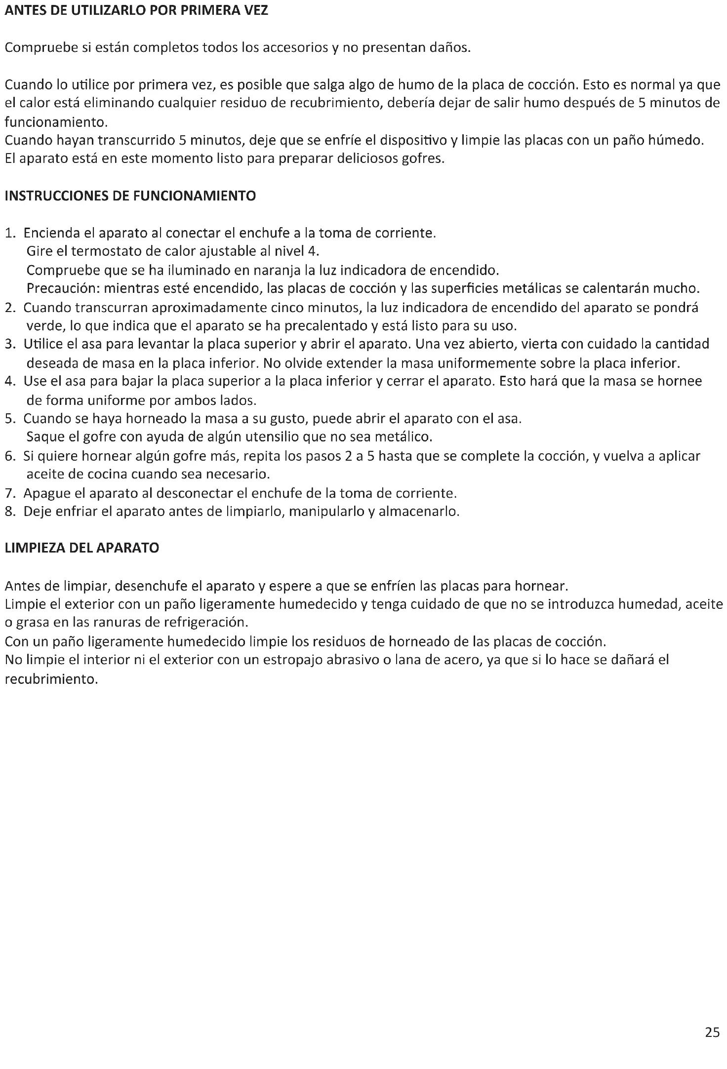 Compruebe si están completos todos los accesorios y no presentan daños. Cuando lo ulice por primera vez, es posible que salga algo de humo de la placa de cocción. Esto es normal ya que el calor está eliminando cualquier residuo de recubrimiento, debería dejar de salir humo después de 5 minutos de funcionamiento. Cuando hayan transcurrido 5 minutos, deje que se enfríe el disposivo y limpie las placas con un paño húmedo. El aparato está en este momento listo para preparar deliciosos gofres.
