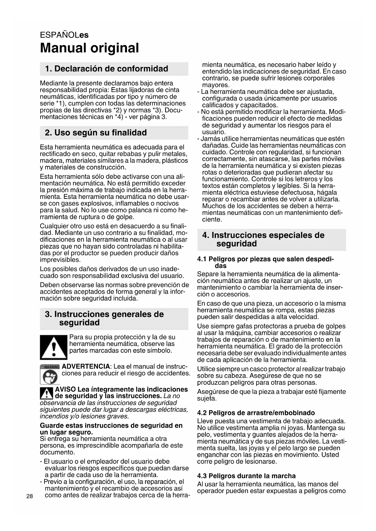 Manual original Mediante la presente declaramos bajo entera responsabilidad propia: Estas lijadoras de cinta neumáticas, identificadas por tipo y número de serie *1), cumplen con todas las determinaciones propias de las directivas *2) y normas *3). Docu- mentaciones técnicas en *4) - ver página 3. Esta herramienta neumática es adecuada para el rectificado en seco, quitar rebabas y pulir metales, madera, materiales similares a la madera, plásticos y materiales de construcción. Esta herramienta sólo debe activarse con una ali- mentación neumática. No está permitido exceder la presión máxima de trabajo indicada en la herra- mienta. Esta herramienta neumática no debe usar- se con gases explosivos, inflamables o nocivos para la salud. No lo use como palanca ni como he- rramienta de ruptura o de golpe. Cualquier otro uso está en desacuerdo a su finali- dad. Mediante un uso contrario a su finalidad, mo- dificaciones en la herramienta neumática o al usar piezas que no hayan sido controladas ni habilita- das por el productor se pueden producir daños imprevisibles. Los posibles daños derivados de un uso inade- cuado son responsabilidad exclusiva del usuario. Deben observarse las normas sobre prevención de accidentes aceptados de forma general y la infor- mación sobre seguridad incluida. Para su propia protección y la de su herramienta neumática, observe las partes marcadas con este símbolo. ADVERTENCIA: Lea el manual de instruc- ciones para reducir el riesgo de accidentes. AVISO Lea íntegramente las indicaciones de seguridad y las instrucciones. La no observancia de las instrucciones de seguridad siguientes puede dar lugar a descargas eléctricas, incendios y/o lesiones graves. Guarde estas instrucciones de seguridad en un lugar seguro. Si entrega su herramienta neumática a otra persona, es imprescindible acompañarla de este documento. - El usuario o el empleador del usuario debe evaluar los riesgos específicos que puedan darse a partir de cada uso de la herramienta. - Previo a la configuración, el uso, la reparación, el mantenimiento y el recambio de accesorios así como antes de realizar trabajos cerca de la herra- mienta neumática, es necesario haber leído y entendido las indicaciones de seguridad. En caso contrario, se puede sufrir lesiones corporales mayores. - La herramienta neumática debe ser ajustada, configurada o usada únicamente por usuarios calificados y capacitados. - No está permitido modificar la herramienta. Modi- ficaciones pueden reducir el efecto de medidas de seguridad y aumentar los riesgos para el usuario. - Jamás utilice herramientas neumáticas que estén dañadas. Cuide las herramientas neumáticas con cuidado. Controle con regularidad, si funcionan correctamente, sin atascarse, las partes móviles de la herramienta neumática y si existen piezas rotas o deterioradas que pudieran afectar su funcionamiento. Controle si los letreros y los textos están completos y legibles. Si la herra- mienta eléctrica estuviese defectuosa, hágala reparar o recambiar antes de volver a utilizarla. Muchos de los accidentes se deben a herra- mientas neumáticas con un mantenimiento defi- ciente.