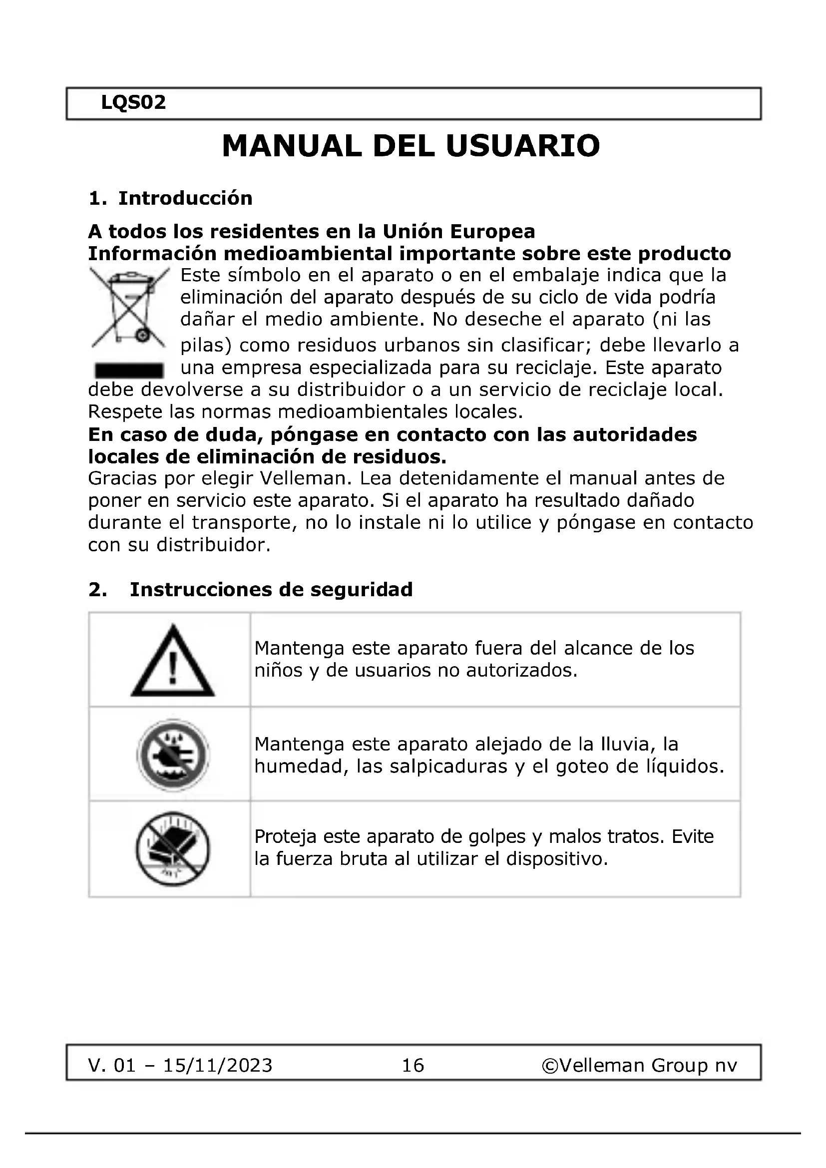 El copyright de este manual es propiedad de Velleman Group nv. Reservados todos los derechos en todo el mundo. Ninguna parte de este manual puede ser copiada, reproducida, traducida o reducida a ningún medio electrónico o de otro tipo sin el consentimiento previo por escrito del titular de los derechos de autor.LQS02