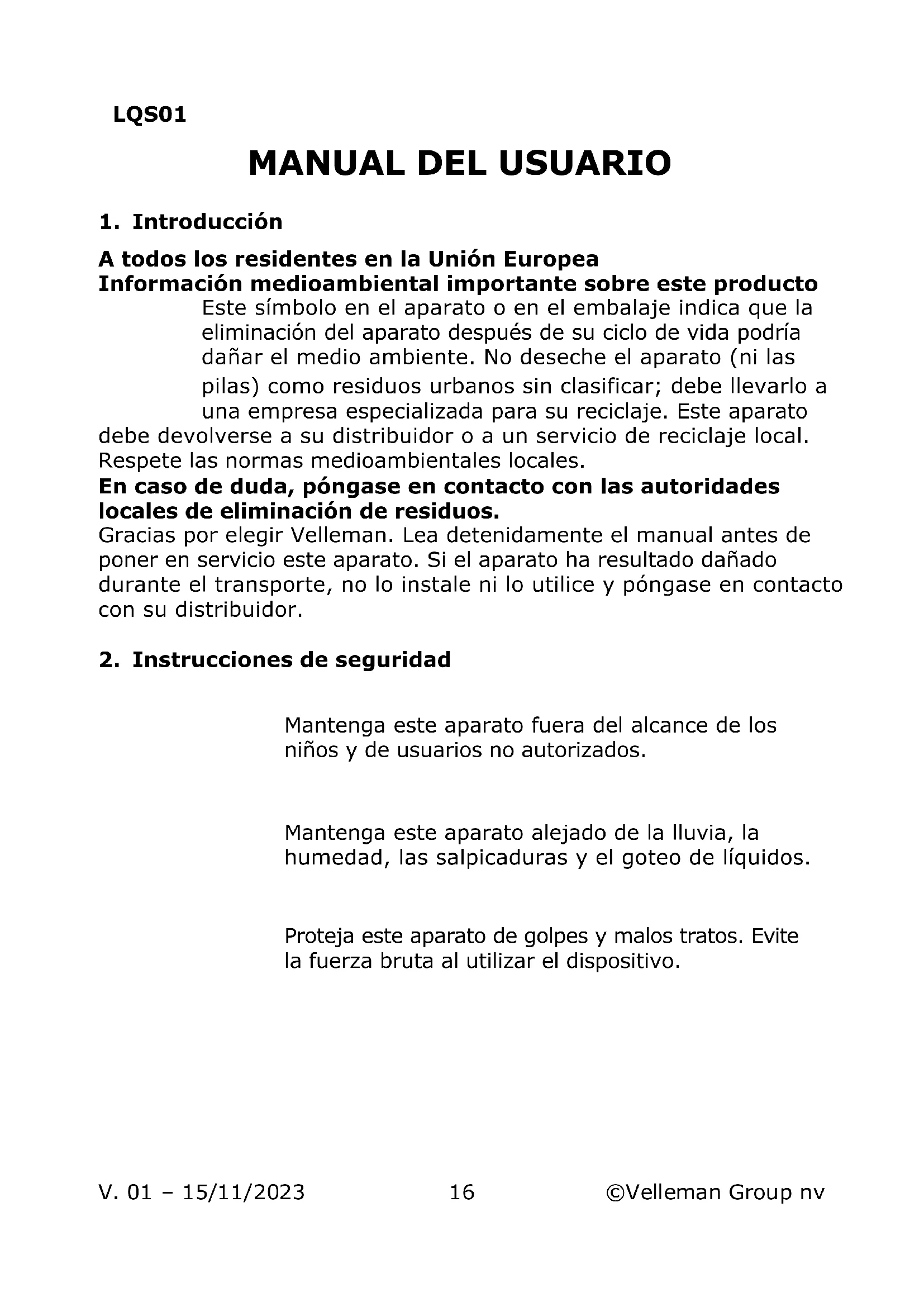 El copyright de este manual es propiedad de Velleman Group nv. Reservados todos los derechos en todo el mundo. Ninguna parte de este manual puede ser copiada, reproducida, traducida o reducida a ningún medio electrónico o de otro tipo sin el consentimiento previo por escrito del titular de los derechos de autor.LQS01