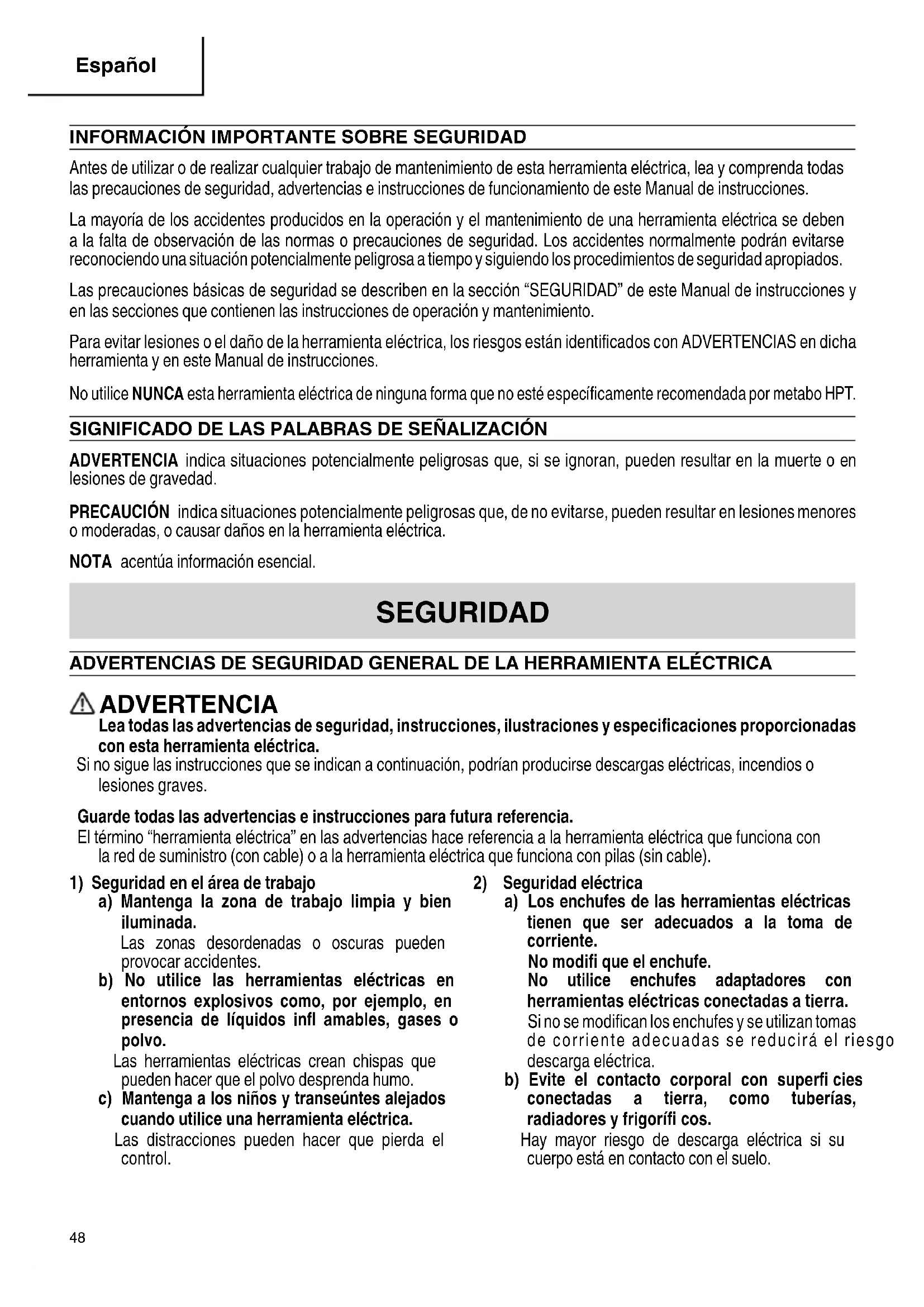 Français 000BookDSDV18DCmetabo.indb47000BookDSDV18DCmetabo.indb47 2022/08/0315:44:532022/08/0315:44:53INFORMACIÓN IMPORTANTE SOBRE SEGURIDAD Antes de utilizar o de realizar cualquier trabajo de mantenimiento de esta herramienta eléctrica, lea y comprenda todas las precauciones de seguridad, advertencias e instrucciones de funcionamiento de este Manual de instrucciones. La mayoría de los accidentes producidos en la operación y el mantenimiento de una herramienta eléctrica se deben a la falta de observación de las normas o precauciones de seguridad. Los accidentes normalmente podrán evitarse reconociendo una situación potencialmente peligrosa a tiempo y siguiendo los procedimientos de seguridad apropiados. Las precauciones básicas de seguridad se describen en la sección “SEGURIDAD” de este Manual de instrucciones y en las secciones que contienen las instrucciones de operación y mantenimiento. Para evitar lesiones o el daño de la herramienta eléctrica, los riesgos están identifi cados con ADVERTENCIAS en dicha herramienta y en este Manual de instrucciones. No utilice NUNCA esta herramienta eléctrica de ninguna forma que no esté específi camente recomendada por metabo HPT. SIGNIFICADO DE LAS PALABRAS DE SEÑALIZACIÓN ADVERTENCIA indica situaciones potencialmente peligrosas que, si se ignoran, pueden resultar en la muerte o en lesiones de gravedad. PRECAUCIÓN indica situaciones potencialmente peligrosas que, de no evitarse, pueden resultar en lesiones menores o moderadas, o causar daños en la herramienta eléctrica. NOTA acentúa información esencial. SEGURIDAD ADVERTENCIAS DE SEGURIDAD GENERAL DE LA HERRAMIENTA ELÉCTRICA ADVERTENCIA Lea todas las advertencias de seguridad, instrucciones, ilustraciones y especifi caciones proporcionadas con esta herramienta eléctrica. Si no sigue las instrucciones que se indican a continuación, podrían producirse descargas eléctricas, incendios o lesiones graves. Guarde todas las advertencias e instrucciones para futura referencia. El término “herramienta eléctrica” en las advertencias hace referencia a la herramienta eléctrica que funciona con la red de suministro (con cable) o a la herramienta eléctrica que funciona con pilas (sin cable).