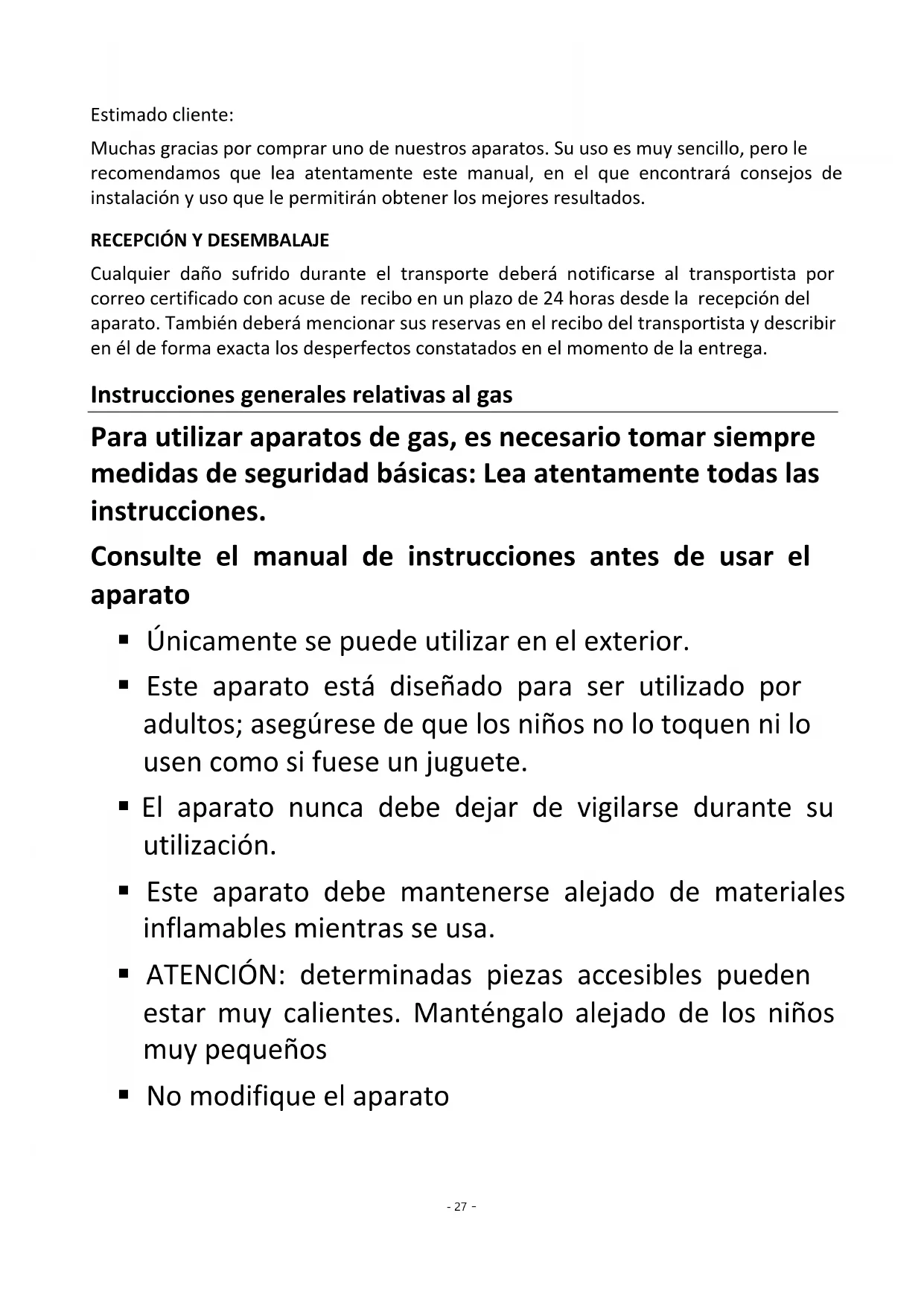 Cualquier daño sufrido durante el transporte deberá notificarse al transportista por correo certificado con acuse de recibo en un plazo de 24 horas desde la recepción del aparato. También deberá mencionar sus reservas en el recibo del transportista y describir en él de forma exacta los desperfectos constatados en el momento de la entrega. Instrucciones generales relativas al gas Para utilizar aparatos de gas, es necesario tomar siempre medidas de seguridad básicas: Lea atentamente todas las instrucciones. Consulte el manual de instrucciones antes de usar el aparato
