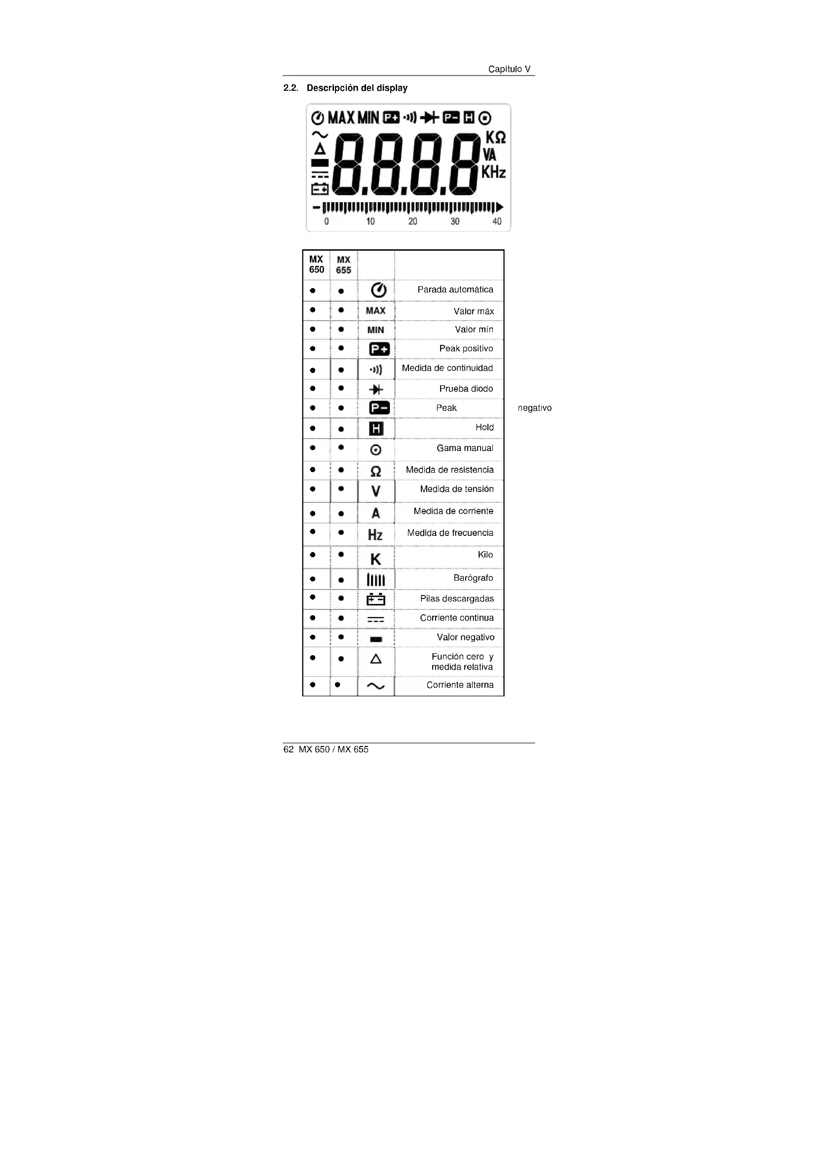 12Capítulo V 62 MX 650 / MX 655 2.2. Descripción del display