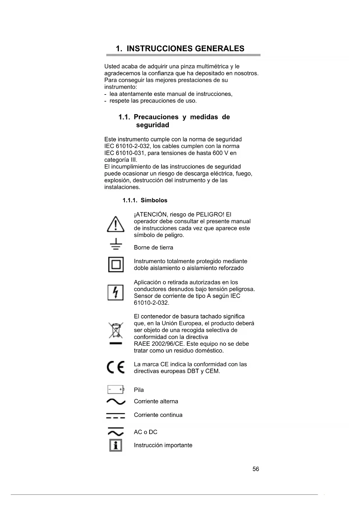 Usted acaba de adquirir una pinza multimétrica y le agradecemos la confianza que ha depositado en nosotros. Para conseguir las mejores prestaciones de su instrumento: - lea atentamente este manual de instrucciones, - respete las precauciones de uso. Precauciones y medidas de seguridad Este instrumento cumple con la norma de seguridad IEC 61010-2-032, los cables cumplen con la norma IEC 61010-031, para tensiones de hasta 600 V en categoría III. El incumplimiento de las instrucciones de seguridad puede ocasionar un riesgo de descarga eléctrica, fuego, explosión, destrucción del instrumento y de las instalaciones.