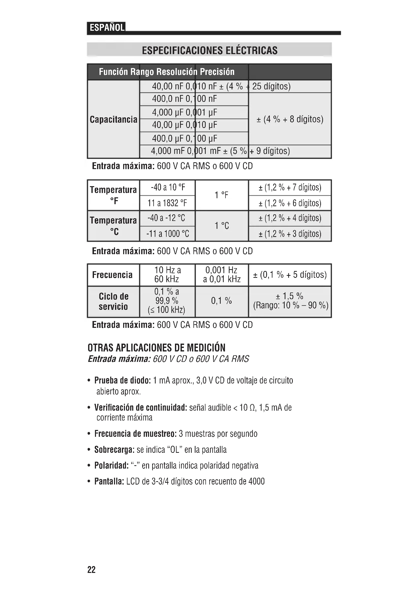 - Prueba de diodo: 1mA aprox., 3,0V CD de voltaje de circuito abiertoaprox.