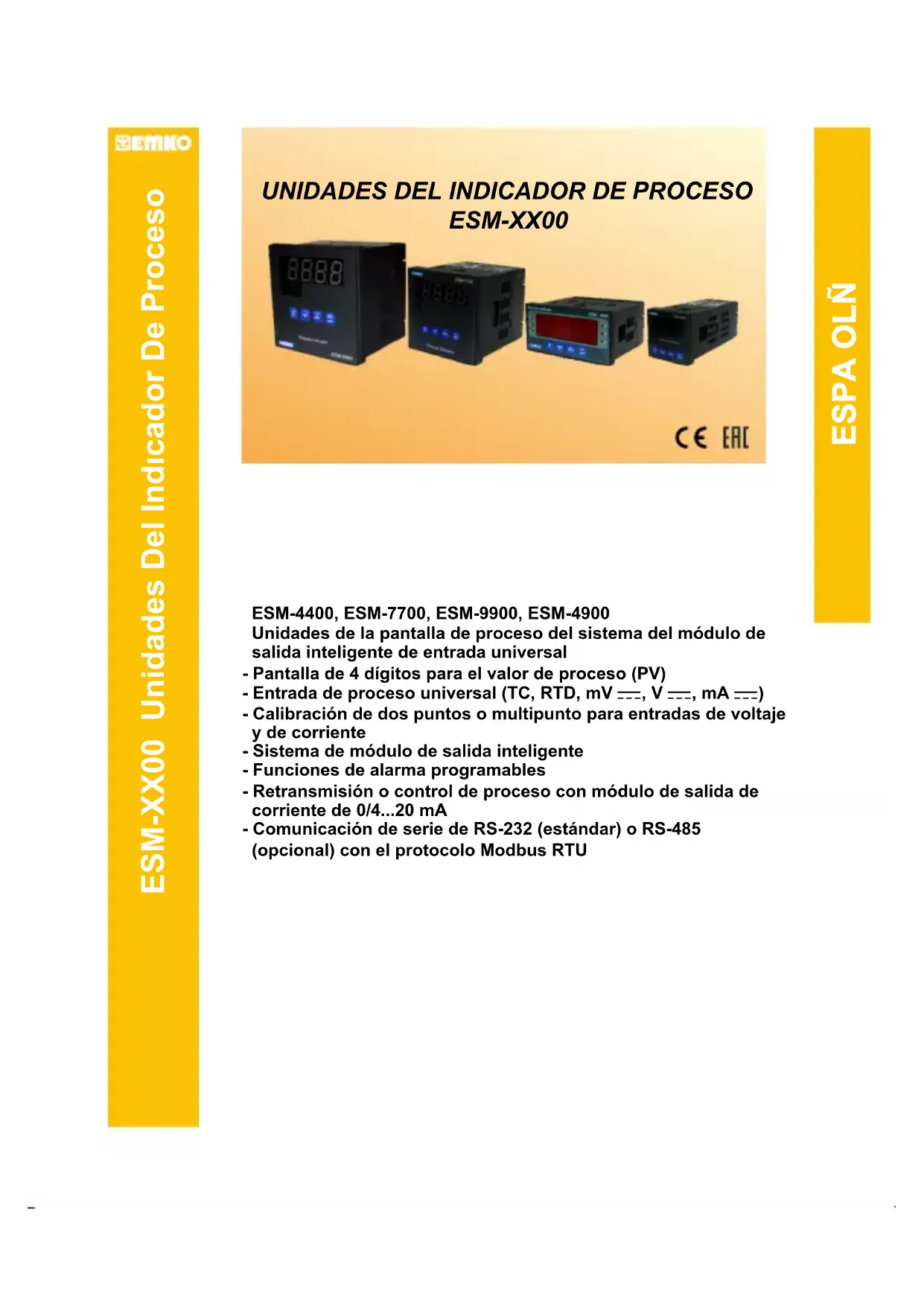 Unidades de la pantalla de proceso del sistema del módulo de salida inteligente de entrada universal - Pantalla de 4 dígitos para el valor de proceso (PV) - Entrada de proceso universal (TC, RTD, mV , V , mA )Z Z Z - Calibración de dos puntos o multipunto para entradas de voltaje y de corriente - Sistema de módulo de salida inteligente - Funciones de alarma programables - Retransmisión o control de proceso con módulo de salida de corriente de 0/4...20 mA - Comunicación de serie de RS-232 (estándar) o RS-485 (opcional) con el protocolo Modbus RTUESPA OLÑ ESPECIFICACIONES