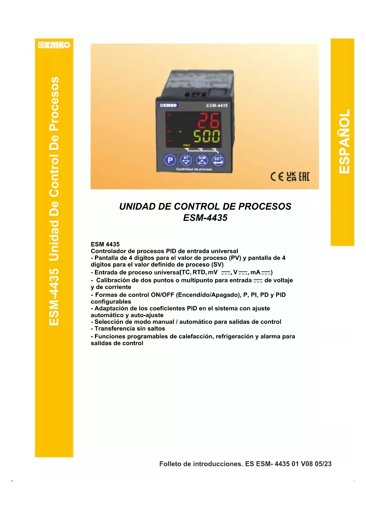Controlador de procesos PID de entrada universal (TC, RTD, mV Z, V Z, mA Z) - Calibración de dos puntos o multipunto para entrada Z de voltaje y de corriente Formas de control ON/OFF (Encendido/Apagado), P, PI, PD y PID configurables - Adaptación de los coeficientes PID en el sistema con ajuste automático y auto-ajuste - Selección de modo manual / automático para salidas de control - Transferencia sin saltos - Funciones programables de calefacción, refrigeración y alarma para salidas de control ESPAÑOL Folleto de introducciones. ES ESM- 4435 01 V08 05/23ESPECIFICACIONES