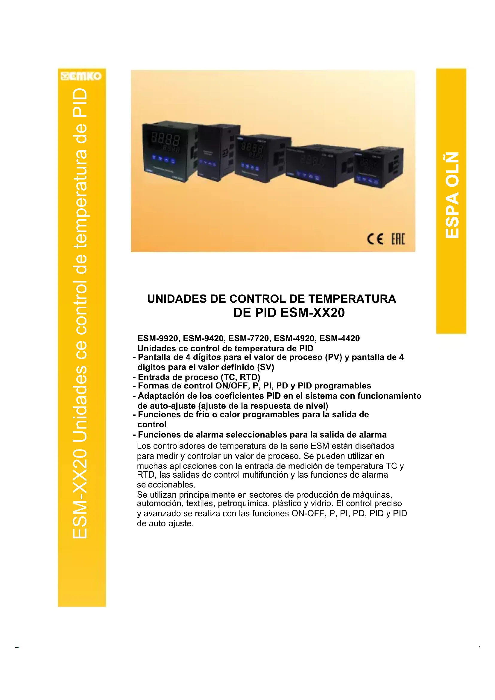 Los controladores de temperatura de la serie ESM están diseñados para medir y controlar un valor de proceso. Se pueden utilizar en muchas aplicaciones con la entrada de medición de temperatura TC y RTD, las salidas de control multifunción y las funciones de alarma seleccionables.Se utilizan principalmente en sectores de producción de máquinas, automoción, textiles, petroquímica, plástico y vidrio. El control preciso y avanzado se realiza con las funciones ON-OFF, P, PI, PD, PID y PID de auto-ajuste. ESM-9920, ESM-9420, ESM-7720, ESM-4920, ESM-4420 Unidades ce control de temperatura de PID- Pantalla de 4 dígitos para el valor de proceso (PV) y pantalla de 4 dígitos para el valor definido (SV)- Entrada de proceso (TC, RTD)- Formas de control ON/OFF, P, PI, PD y PID programables- Adaptación de los coeficientes PID en el sistema con funcionamiento de auto-ajuste (ajuste de la respuesta de nivel) - Funciones de frío o calor programables para la salida de control - Funciones de alarma seleccionables para la salida de alarmaESPA OLÑ