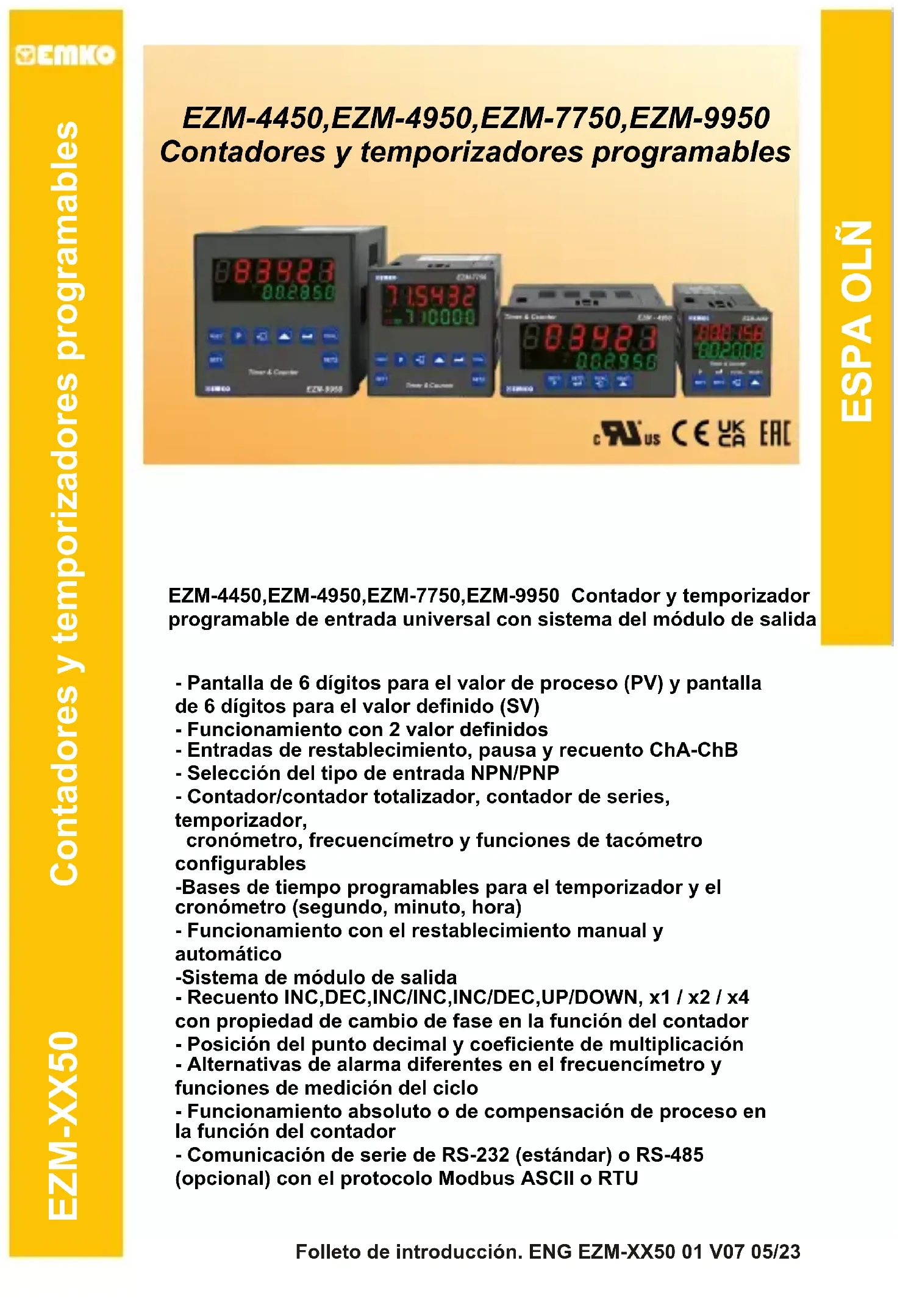 Contadores y temporizadores programables EZM-4450,EZM-4950,EZM-7750,EZM-9950 Contador y temporizador programable de entrada universal con sistema del módulo de salida ESPA OLÑ - Pantalla de 6 dígitos para el valor de proceso (PV) y pantalla de 6 dígitos para el valor definido (SV) - Funcionamiento con 2 valor definidos - Entradas de restablecimiento, pausa y recuento ChA-ChB - Selección del tipo de entrada NPN/PNP - Contador/contador totalizador, contador de series, temporizador, cronómetro, frecuencímetro y funciones de tacómetro configurables -Bases de tiempo programables para el temporizador y el cronómetro (segundo, minuto, hora) - Funcionamiento con el restablecimiento manual y automático -Sistema de módulo de salida - Recuento INC,DEC,INC/INC,INC/DEC,UP/DOWN, x1 / x2 / x4 con propiedad de cambio de fase en la función del contador - Posición del punto decimal y coeficiente de multiplicación - Alternativas de alarma diferentes en el frecuencímetro y funciones de medición del ciclo - Funcionamiento absoluto o de compensación de proceso en la función del contador - Comunicación de serie de RS-232 (estándar) o RS-485 (opcional) con el protocolo Modbus ASCII o RTU Folleto de introducción. ENG EZM-XX50 01 V07 05/23ESPECIFICACIONES: ENTRADA: Entradas de recuento (Ch-A,Ch-B): Se puede conectar el codificador o el sensor capacitivo, de proximidad o del conmutador Entrada de restablecimiento: Se puede conectar el sensor capacitivo, de proximidad o del conmutador. Entrada de pausa: Se puede conectar el sensor capacitivo, de proximidad o del conmutador. Selección del tipo de entrada: Se puede seleccionar NPN/PNP con el conmutador DIP que se localiza en el dispositivo. Función de restablecimiento: automática o manual. Tipos de entrada de recuento: INC,DEC,INC/INC,INC/DEC,UP/DOWN, x1 / x2 / x4 Recuento del cambio de fase (para el codificador) SALIDA Módulos de salida: Hay dos tomas de módulos para enchufar los módulos de salida. - Módulo de salida del relé - Módulo de salida del SSR (máx. 26 mA , Máx. 22 VZ) - Módulo de salida digital (Transistor) (Máx. 40 mA @ 18 VZ) PANTALLA Pantalla del valor de recuento real: EZM-4450: Pantalla LED 8 mm roja de 6 dígitos EZM-4950: Pantalla LED 13,2 mm roja de 6 dígitos EZM-7750: Pantalla LED 10,8 mm roja de 6 dígitos EZM-9950: Pantalla LED 13,2 mm roja de 6 dígitos Pantalla del valor definido: EZM-4450: Pantalla LED 8 mm verde de 6 dígitos EZM-4950: Pantalla LED 8 mm verde de 6 dígitos EZM-7750: Pantalla LED 8 mm verde de 6 dígitos EZM-9950: Pantalla LED 8 mm verde de 6 dígitos LED: LED de S1(valor Set1 (Ajuste1)),S2(valor Set2 (Ajuste2)),O1/2(estado de salida)