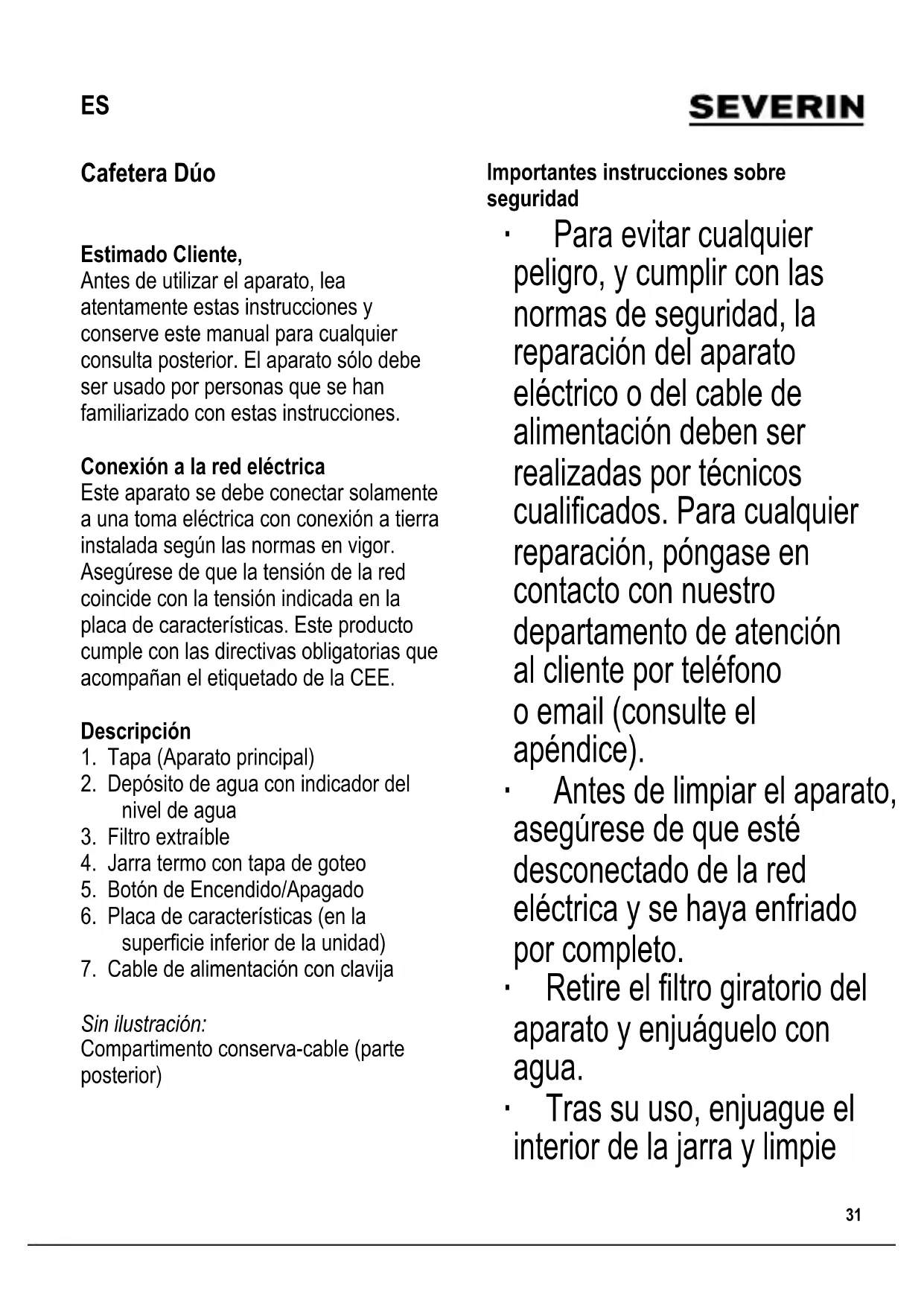 de seguridad. ∙ No se debe permitir que los niños realicen ningún trabajo de limpieza o mantenimiento del aparato a menos que estén bajo vigilancia y tengan más de 8 años. ∙ El aparato y su cable eléctrico siempre se deben mantener fuera del alcance de niños menores de 8 años. ∙ Los niños no deben jugar con el aparato. ∙ Precaución: Mantenga a los niños alejados del material de embalaje, porque podría ser peligroso, existe el peligrodeasxia. ∙ Cierre siempre la jarra con su tapa de goteo. No deje la jarra termo desatendida y al alcance de los niños. ∙ Antes de utilizar el aparato, siempre se debe comprobar que tanto la unidad principal, el cable de alimentación como cualquier accesorio no están defectuosos. En caso de que el aparato hayacaídosobreunasuperciedura, o se haya tirado en exceso del cable de alimentación, no se deberá utilizar de nuevo: incluso los desperfectos no visibles pueden tener efectos adversos sobre la seguridad en el uso del aparato. ∙ Coloquelacafeterasobreunasupercie estable, antideslizante y a prueba de salpicaduras. ∙ Evite que la carcasa o el cable estén en contactoconsuperciescalientes,tales como placas o llamas. ∙ No permita que el cable eléctrico cuelgue suelto; el cable se debe mantenersucientementealejadodelas partes calientes del aparato. ∙ Desenchufe siempre el aparato - si hay una avería, - después del uso, y - antes de limpiarlo. ∙ Para desenchufar, no tire nunca del cable; agarre la clavija. ∙ No toque el enchufe con las manos húmedas. ∙ Antes de abrir la tapa de la cafetera o de cambiar los accesorios, desenchúfela y déjela enfriar. De no ser así, el agua caliente o el vapor que desprende pueden causarle quemaduras. ∙ Supervise la cafetera mientras la utiliza. ∙ Cierre siempre la jarra con su tapa de goteo. No deje la jarra termo desatendida y al alcance de los niños. ∙ No se acepta responsabilidad alguna si hay averías a consecuencia del uso incorrecto del aparato o si estas instrucciones no han sido observadas debidamente.34 104 x 142 mm Compartimento para la conservación del cable En la parte posterior del aparato, existe un compartimento para la conservación del cable. Extraiga el cable a la longitud deseada antes de usar el aparato. Desconexión automática Para ahorrar energía, los modelos de cafeteras con una jarra termo al vacío se apagarán automáticamente cuando haya concluido el ciclo de elaboración del café. Antes del primer uso Antes de preparar café por primera vez, limpie la cafetera en profundidad haciéndola funcionar 2 o 3 veces, llenando el depósito de agua hasta su máxima capacidad pero sin añadir café. Realice este proceso por separado en cada lado. Esta operación es igualmente válida cuando no se ha utilizado la cafetera durante un cierto período de tiempo o incluso después del proceso de descalcicación. Consejos prácticos ∙ Las marcas por duplicado en cada uno de los depósitos de agua le ayudarán a medir la cantidad de agua necesaria para preparar el número deseado de tazas de café. Las marcas situadas a su izquierda corresponden a tazas medianas con una capacidad aproximada de unos 125 ml. Tenga cuidado de no excederse en el número de tazas indicado. ∙ Si necesita varios ciclos consecutivos de elaboración de café, apague la cafetera después de cada ciclo y permita que el aparato se enfríe durante aprox. 5 minutos. ∙ ¡Atención! Cuide de no poner agua en eldepósitodeaguaunaveznalizada la preparación del café, ya que puede salir vapor caliente por la boquilla y ser causa de quemaduras. ¡Peligro de quemaduras! ∙ Precaución: No intente abrir la tapa durante el proceso de elaboración del café: existe peligro de quemaduras. Modo de uso El café se puede preparar en un lado, o en ambos lados a la vez. ∙ Depósito de agua: Abra la tapa, llene el depósito con la cantidad de agua fría deseada y cierre la tapa. ∙ Filtro de papel: Introduzcaunltrodepapeltamaño-4 enelsoporteparaelltro,primero deberá doblar los lados perforados del ltro. ∙ Añadir los granos de café: Es aconsejable utilizar café molido, aproximadamente 6 gr. =1½ - 2 cucharaditas por taza, para una taza mediana (125 ml). ∙ Disposición de la jarra termo: Coloque la tapa de goteo sobre la jarra. Si se ha introducido correctamente, la tapa conseguirá desactivar el mecanismo interrumpe-goteo en el soportedelltroduranteelciclode elaboración del café. Vuelva a situar la jarra en la cafetera. ∙ Inicio del proceso:104 x 142 mm