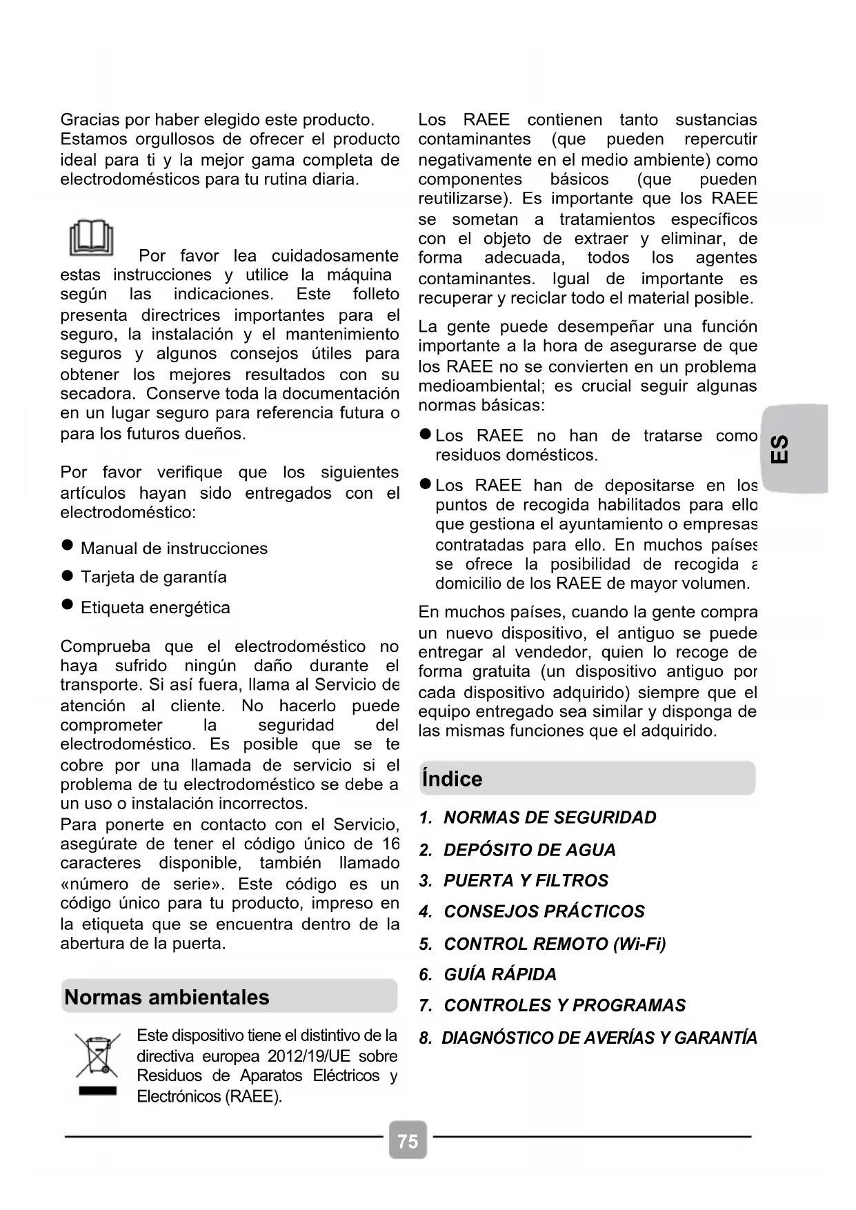 Antes de utilizar el electrodoméstico asegúrese de haber comprendido bien las instrucciones de instalación y uso. No toque el electrodoméstico cuando tenga las manos o los pies mojados o húmedos. No se apoye en la puerta al cargar la secadora ni utilice la puerta para levantar o mover la máquina. ATENCIÓN El uso incorrecto de una secadora puede provocar riesgo de incendio.77