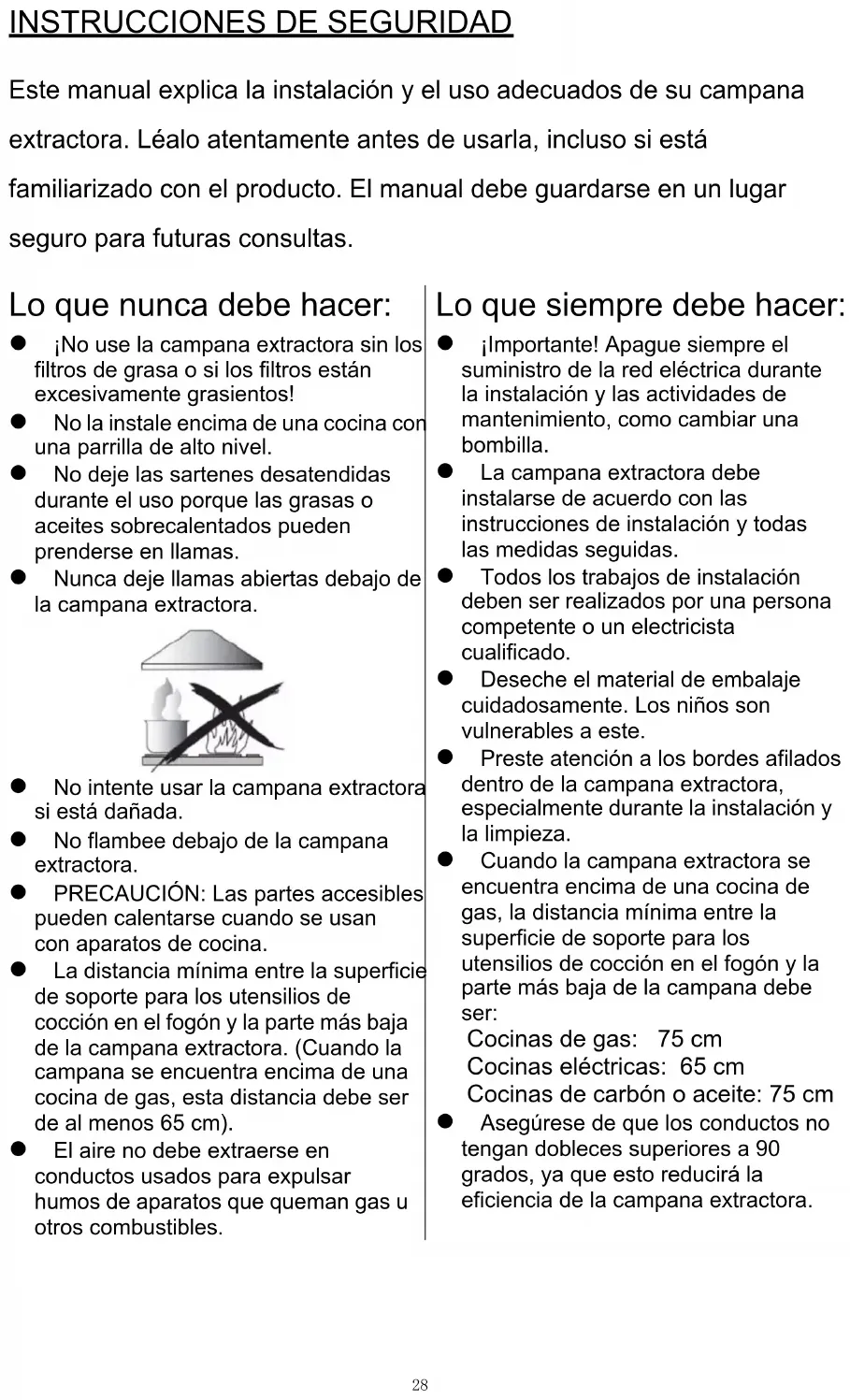 Este manual explica la instalación y el uso adecuados de su campana extractora. Léalo atentamente antes de usarla, incluso si está familiarizado con el producto. El manual debe guardarse en un lugar seguro para futuras consultas. Lo que nunca debe hacer: ¡No use la campana extractora sin los filtros de grasa o si los filtros están excesivamente grasientos! No la instale encima de una cocina con una parrilla de alto nivel. No deje las sartenes desatendidas durante el uso porque las grasas o aceites sobrecalentados pueden prenderse en llamas. Nunca deje llamas abiertas debajo de la campana extractora. Lo que siempre debe hacer: ¡Importante! Apague siempre el suministro de la red eléctrica durante la instalación y las actividades de mantenimiento, como cambiar una bombilla. La campana extractora debe instalarse de acuerdo con las instrucciones de instalación y todas las medidas seguidas. Todos los trabajos de instalación deben ser realizados por una persona competente o un electricista cualificado. Deseche el material de embalaje cuidadosamente. Los niños son vulnerables a este. Preste atención a los bordes afilados dentro de la campana extractora, especialmente durante la instalación y la limpieza. Cuando la campana extractora se encuentra encima de una cocina de gas, la distancia mínima entre la superficie de soporte para los utensilios de cocción en el fogón y la parte más baja de la campana debe ser: Cocinas de gas: 75 cm Cocinas eléctricas: 65 cm Cocinas de carbón o aceite: 75 cm Asegúrese de que los conductos no tengan dobleces superiores a 90 grados, ya que esto reducirá la eficiencia de la campana extractora. No intente usar la campana extractora si está dañada. No flambee debajo de la campana extractora. PRECAUCIÓN: Las partes accesibles pueden calentarse cuando se usan con aparatos de cocina. La distancia mínima entre la superficie de soporte para los utensilios de cocción en el fogón y la parte más baja de la campana extractora. (Cuando la campana se encuentra encima de una cocina de gas, esta distancia debe ser de al menos 65 cm). El aire no debe extraerse en conductos usados para expulsar humos de aparatos que queman gas u otros combustibles. 28 •Advertencia: Si los tornillos o el dispositivo de fijación no se instalan de acuerdo con estas instrucciones, pueden producirse riesgos eléctricos. Lo que siempre debe hacer: Coloque siempre tapas en ollas y sartenes cuando cocine en una cocina de gas. Cuando se encuentre en el modo de extracción, la campana extractora estará extrayendo el aire de la habitación. Asegúrese de que se estén observando las medidas de ventilación adecuadas. La campana extractora elimina los olores de la habitación, pero no el vapor. La campana extractora es solo para uso doméstico. Lo que siempre debe hacer: Precaución: El electrodoméstico y sus accesorios se pueden calentar durante el uso. Trate de evitar tocar los elementos de calentamiento. Los niños menores de 8 años deben mantenerse alejados a menos que estén bajo supervisión permanente. La habitación debe estar adecuadamente ventilada cuando la campana extractora se usa al mismo tiempo que electrodomésticos que quemen gas u otros combustibles. Existe un riesgo de incendio si la limpieza no se lleva a cabo de acuerdo con las instrucciones. Deben cumplirse las normativas relativas a la extracción de aire. Limpie su electrodoméstico periódicamente siguiendo el método indicado en el capítulo MANTENIMIENTO. Por razones de seguridad, use solo tornillos de fijación o montaje del tamaño recomendado en este manual de instrucciones. En cuanto a los detalles sobre el método y la frecuencia de limpieza, consulte la sección de mantenimiento y limpieza en el manual de instrucciones. Las operaciones de limpieza y mantenimiento no deben ser realizadas por niños sin supervisión. Cuando la campana extractora y los electrodomésticos que funcionan con energía que no sea electricidad están funcionando simultáneamente, la presión negativa en la habitación no debe superar los 4 Pa (4 x 10-5 bar). PRECAUCIÓN: Peligro de incendio: no almacene artículos sobre las superficies de cocción. No se debe utilizar un limpiador a vapor. Si el cable de alimentación está dañado, debe ser sustituido por el fabricante, por el servicio técnico o cualquier profesional cualificado similar para evitar peligros. Este electrodoméstico puede ser utilizado por niños a partir de 8 años y por personas con capacidades físicas, sensoriales o mentales reducidas, o sin experiencia o conocimientos, siempre y cuando previamente hayan recibido la supervisión y las instrucciones necesarias para utilizar el aparato de forma segura y comprendan los riesgos que implica. Los niños no deben jugar con este electrodoméstico. Las operaciones de limpieza y mantenimiento no deben ser realizadas por niños sin supervisión. 29 Advertencia: Antes de obtener acceso a los terminales, todos los circuitos de suministro deben estar desconectados. NUNCA intente apagar un incendio con agua; debe apagar el aparato y cubrir posteriormente la llama, p. ej., con una tapa o una manta contra incendios. 30INSTALACIÓN (VENTILACIÓN EXTERIOR)