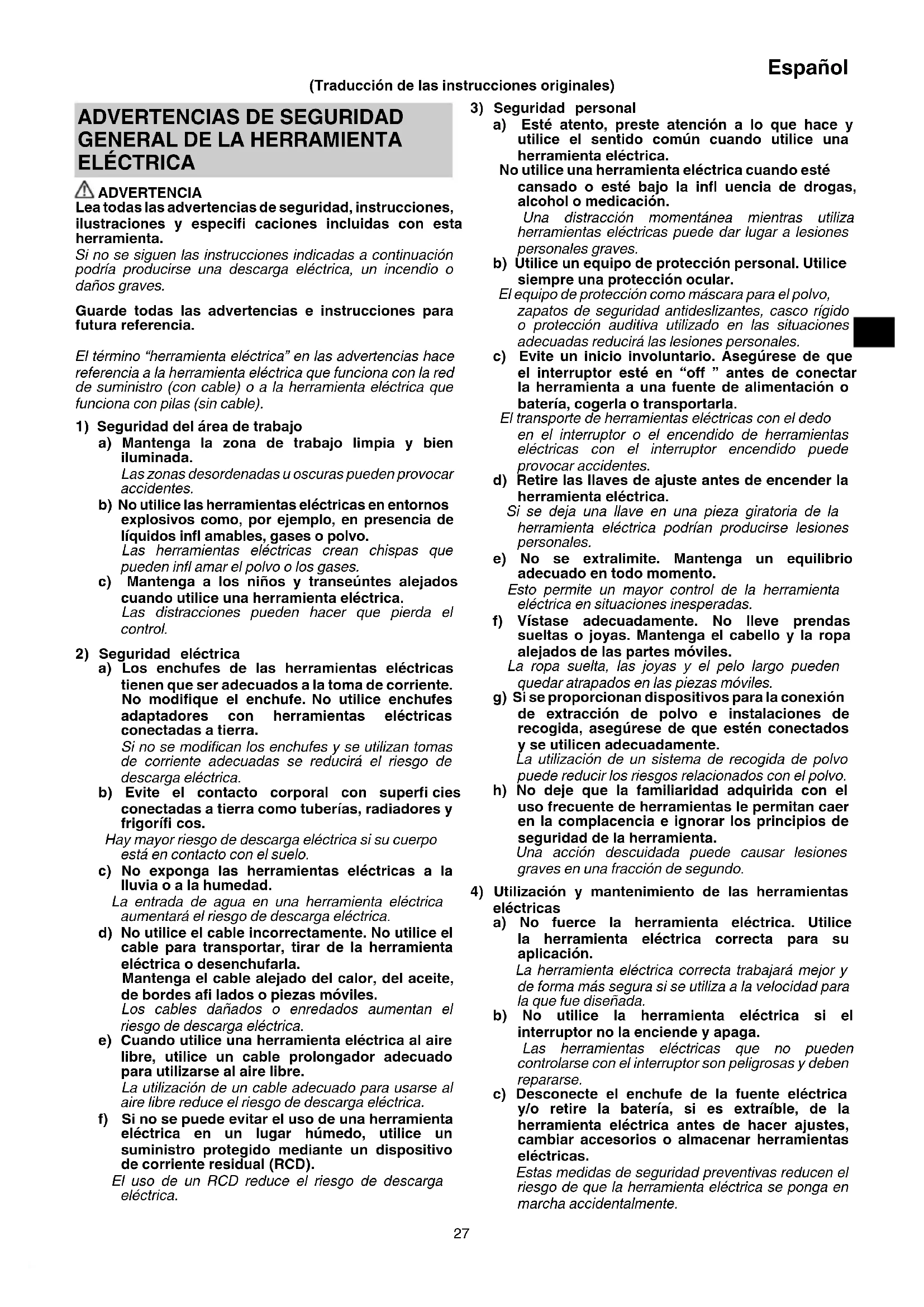 a) Los enchufes de las herramientas eléctricas tienen que ser adecuados a la toma de corriente. No modifi que el enchufe. No utilice enchufes adaptadores con herramientas eléctricas conectadas a tierra. Si no se modifi can los enchufes y se utilizan tomas de corriente adecuadas se reducirá el riesgo de descarga eléctrica. b) Evite el contacto corporal con superfi cies conectadas a tierra como tuberías, radiadores y frigorífi cos. Hay mayor riesgo de descarga eléctrica si su cuerpo está en contacto con el suelo. c) No exponga las herramientas eléctricas a la lluvia o a la humedad. La entrada de agua en una herramienta eléctrica aumentará el riesgo de descarga eléctrica. d) No utilice el cable incorrectamente. No utilice el cable para transportar, tirar de la herramienta eléctrica o desenchufarla. Mantenga el cable alejado del calor, del aceite, de bordes afi lados o piezas móviles. Los cables dañados o enredados aumentan el riesgo de descarga eléctrica. e) Cuando utilice una herramienta eléctrica al aire libre, utilice un cable prolongador adecuado para utilizarse al aire libre. La utilización de un cable adecuado para usarse al aire libre reduce el riesgo de descarga eléctrica. f) Si no se puede evitar el uso de una herramienta eléctrica en un lugar húmedo, utilice un suministro protegido mediante un dispositivo de corriente residual (RCD). El uso de un RCD reduce el riesgo de descarga eléctrica. 0000BookCJ160V.indb270000BookCJ160V.indb27 2019/11/0111:54:152019/11/0111:54:1528 Español d) Guarde las herramientas eléctricas que no se utilicen fuera del alcance de los niños, y no permita que utilicen las herramientas eléctricas personas no familiarizadas con las mismas o con estas instrucciones. Las herramientas eléctricas son peligrosas si son utilizadas por usuarios sin formación. e) Realice el mantenimiento de las herramientas eléctricas y accesorios. Compruebe si las piezas móviles están mal alineadas o unidas, si hay alguna pieza rota u otra condición que pudiera afectar al funcionamiento de las herramientas eléctricas. Si la herramienta eléctrica está dañada, llévela a reparar antes de utilizarla. Se producen muchos accidentes por no realizar un mantenimiento correcto de las herramientas eléctricas. f) Mantenga las herramientas de corte afi ladas y limpias. Las herramientas de corte correctamente mantenidas con los bordes de corte afi lados son más fáciles de controlar, y existe menor riesgo de que se atasquen. g) Utilice la herramienta eléctrica, los accesorios y las brocas de la herramienta, etc. de acuerdo con estas instrucciones, teniendo en cuenta las condiciones de trabajo y el trabajo que se va a realizar. La utilización de la herramienta eléctrica para operaciones diferentes a las previstas podría dar lugar a una situación peligrosa. h) Mantenga los mangos y las superfi cies de agarre secas, limpias y libres de aceite y grasa. Los mangos y las superfi cies de agarre resbaladizos no permiten el manejo y el control seguros de la herramienta en situaciones inesperadas.