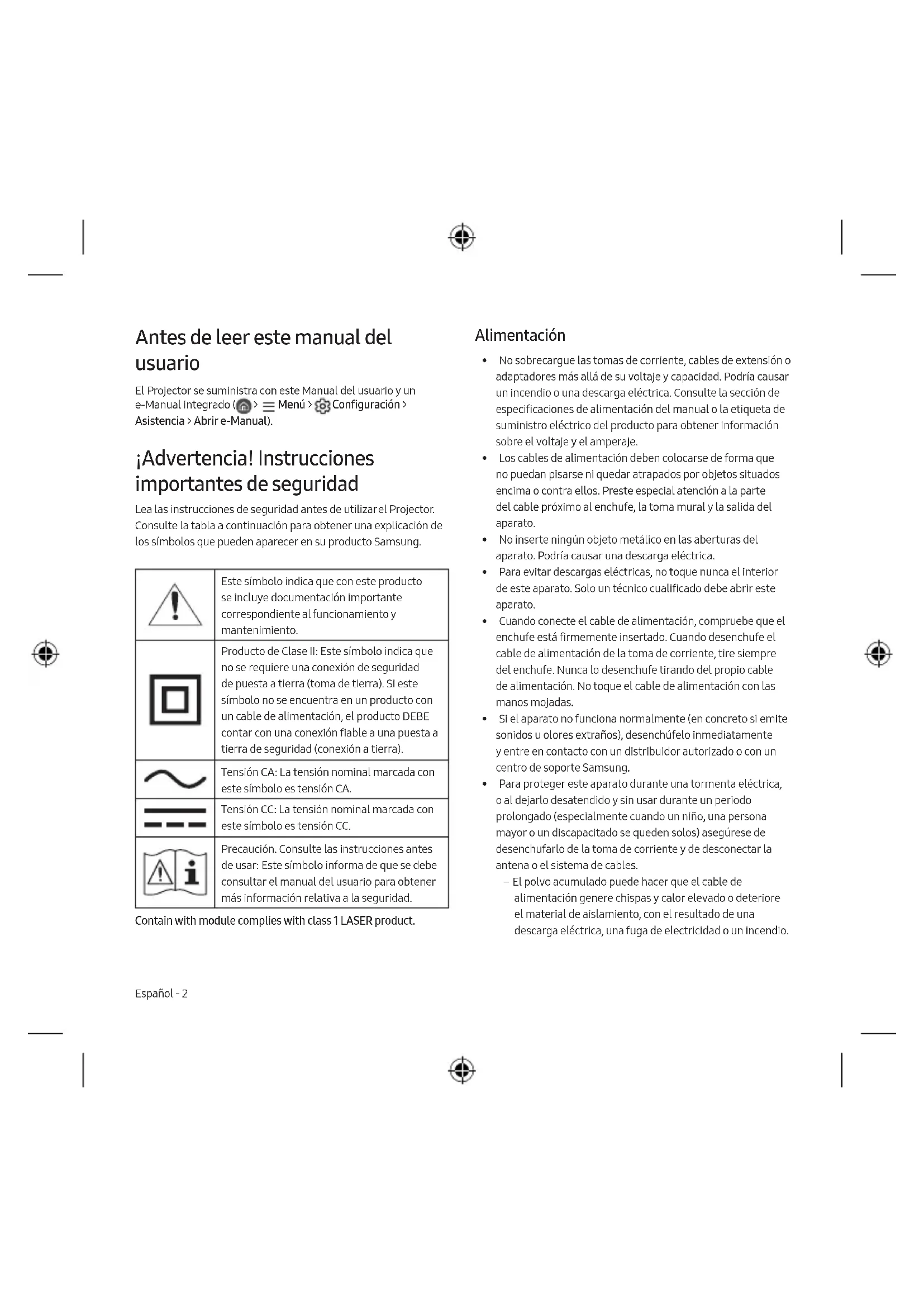 - Deze licenties worden mogelijk niet ondersteund, afhankelijk van het model of de regio. The terms HDMI and HDMI High-Definition Multimedia Interface, and the HDMI Logo are trademarks or registered trademarks of HDMI Licensing Administrator, Inc. in the United States and other countries.Deze pagina is opzettelijk leeg gelaten.Español - 2 Antes de leer este manual del usuario El Projector se suministra con este Manual del usuario y un e-Manual integrado ( > Menú > Configuración > Asistencia > Abrir e-Manual). ¡Advertencia! Instrucciones importantes de seguridad Lea las instrucciones de seguridad antes de utilizar el Projector. Consulte la tabla a continuación para obtener una explicación de los símbolos que pueden aparecer en su producto Samsung. Este símbolo indica que con este producto se incluye documentación importante correspondiente al funcionamiento y mantenimiento. Producto de Clase II: Este símbolo indica que no se requiere una conexión de seguridad de puesta a tierra (toma de tierra). Si este símbolo no se encuentra en un producto con un cable de alimentación, el producto DEBE contar con una conexión fiable a una puesta a tierra de seguridad (conexión a tierra). Tensión CA: La tensión nominal marcada con este símbolo es tensión CA. Tensión CC: La tensión nominal marcada con este símbolo es tensión CC. Precaución. Consulte las instrucciones antes de usar: Este símbolo informa de que se debe consultar el manual del usuario para obtener más información relativa a la seguridad. Contain with module complies with class 1 LASER product. Alimentación