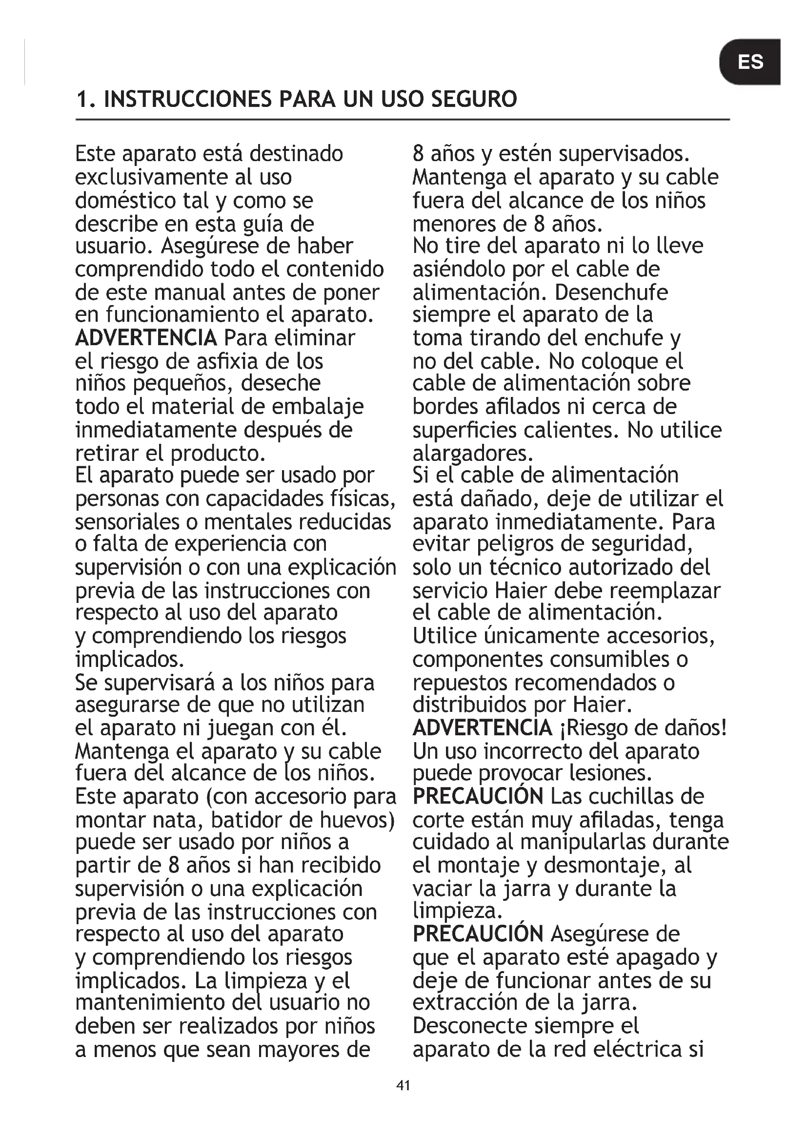 funcionamento. Espere até que a unidade arrefeça completamente antes de voltar a ser utilizada.41 Este aparato está destinado exc lusivamente al uso doméstico tal y como se describe en esta guía de usuario. Asegúrese de haber comprendido todo el contenido de este manual antes de poner en funcionamiento el aparato. ADVERTENCIA Para eliminar el riesgo de asxia de los niños pequeños, deseche todo el material de embalaje inmediatamente después de retirar el producto. El aparato puede ser usado por personas con capacidades físicas, sensoriales o mentales reducidas o falta de experiencia con supervisión o con una explicación previa de las instrucciones con respecto al uso del aparato y comprendiendo los riesgos implicados. Se supervisará a los niños para asegurarse de que no utilizan el aparato ni juegan con él. Mantenga el aparato y su cable fuera del alcance de los niños. Este aparato (con accesorio para montar nata, batidor de huevos) puede ser usado por niños a partir de 8 años si han recibido supervisión o una explicación previa de las instrucciones con respecto al uso del aparato y comprendiendo los riesgos implicados. La limpieza y el mantenimiento del usuario no deben ser realizados por niños a menos que sean mayores de 8 años y estén supervisados. Mantenga el aparato y su cable fuera del alcance de los niños menores de 8 años. No tire del aparato ni lo lleve asiéndolo por el cable de alimentación. Desenchufe siempre el aparato de la toma tirando del enchufe y no del cable. No coloque el cable de alimentación sobre bordes alados ni cerca de supercies calientes. No utilice alargadores. Si el cable de alimentación está dañado, deje de utilizar el aparato inmediatamente. Para evitar peligros de seguridad, solo un técnico autorizado del servicio Haier debe reemplazar el cable de alimentación. Utilice únicamente accesorios, componentes consumibles o repuestos recomendados o distribuidos por Haier. ADVERTENCIA ¡Riesgo de daños! Un uso incorrecto del aparato puede provocar lesiones. PRECAUCIÓN Las cuchillas de corte están muy aladas, tenga cuidado al manipularlas durante el montaje y desmontaje, al vaciar la jarra y durante la limpieza. PRECAUCIÓN Asegúrese de que el aparato esté apagado y deje de funcionar antes de su extracción de la jarra. Desconecte siempre el aparato de la red eléctrica si